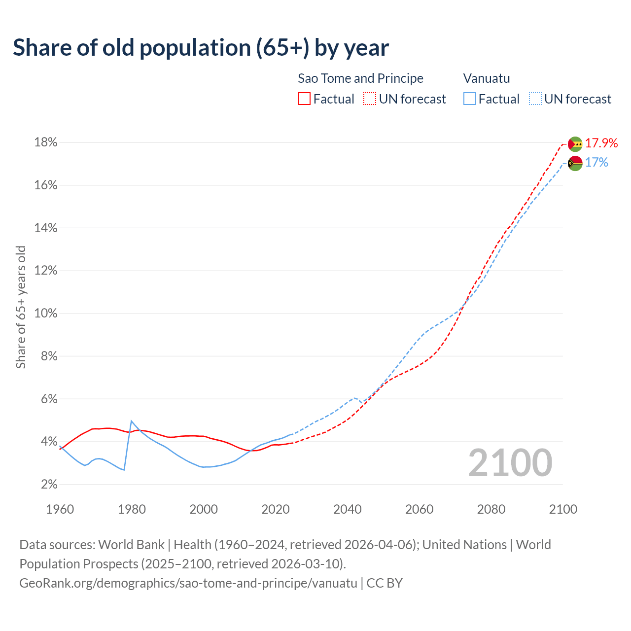 - The share of old-age demographic (65+) in Sao Tome and Principe is 3.9% vs 4.3% in Vanuatu.