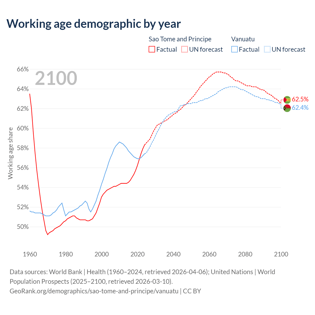 Median age Sao Tome and Principe vs Vanuatu, 1960-2100