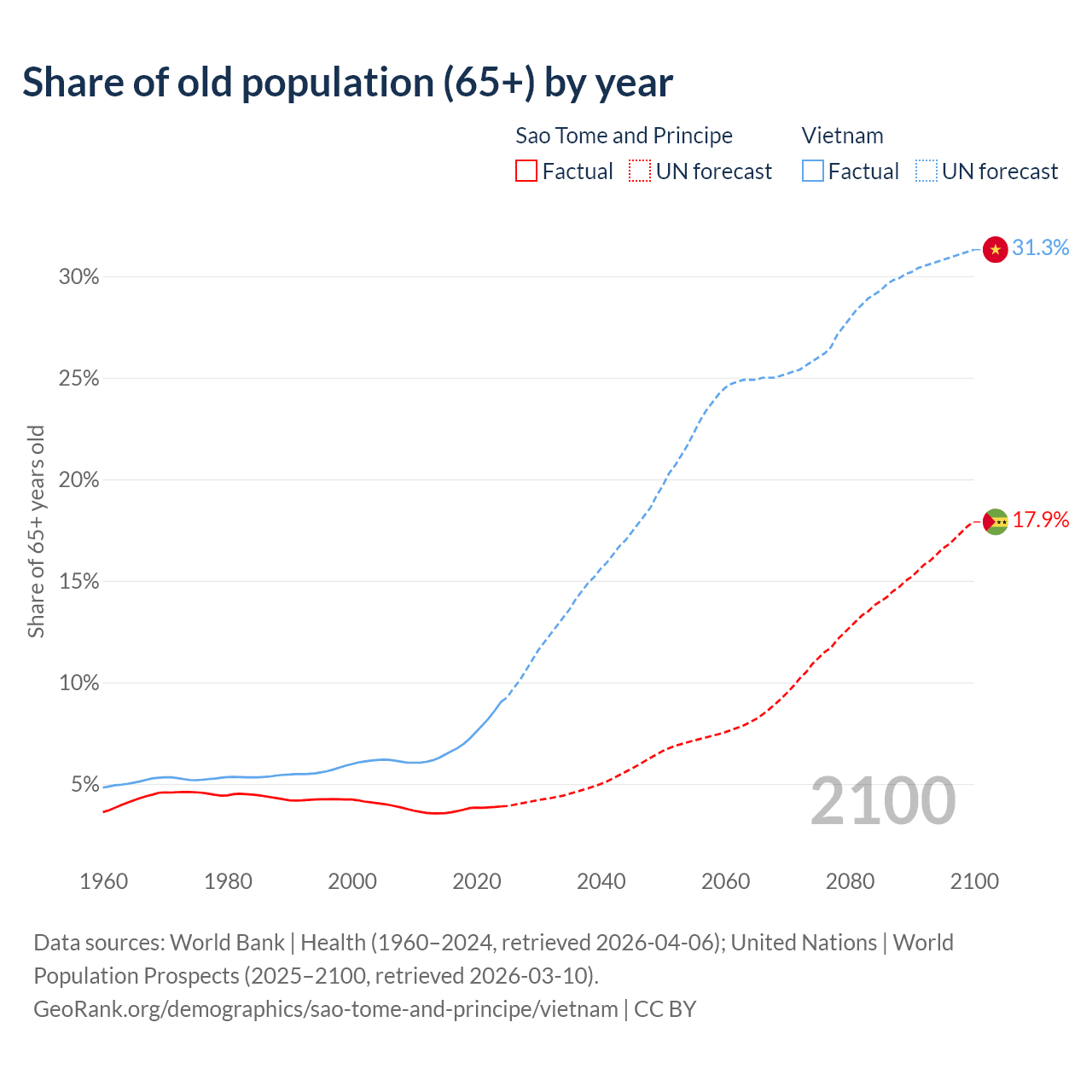 The share of older people aged 65 and over is 3.9% in Sao Tome and Principe and 9.05% in Vietnam. Life expectancy in Sao Tome and Principe compared to Vietnam .