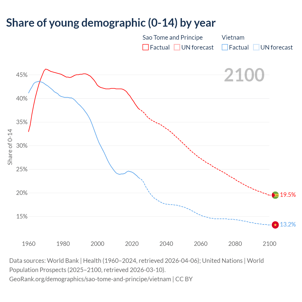 - The share of young demographic (0-15 years old) in Sao Tome and Principe is 37.8% vs 23.2% in Vietnam.