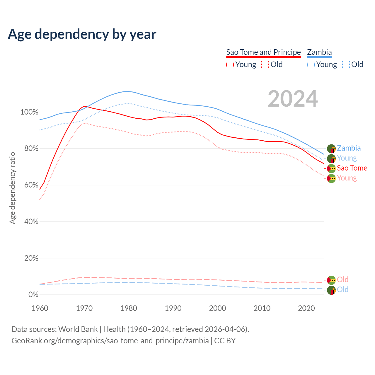 - Sao Tome and Principe is ranked 163/196 by median age (oldest to youngest) vs 182/196 for Zambia.