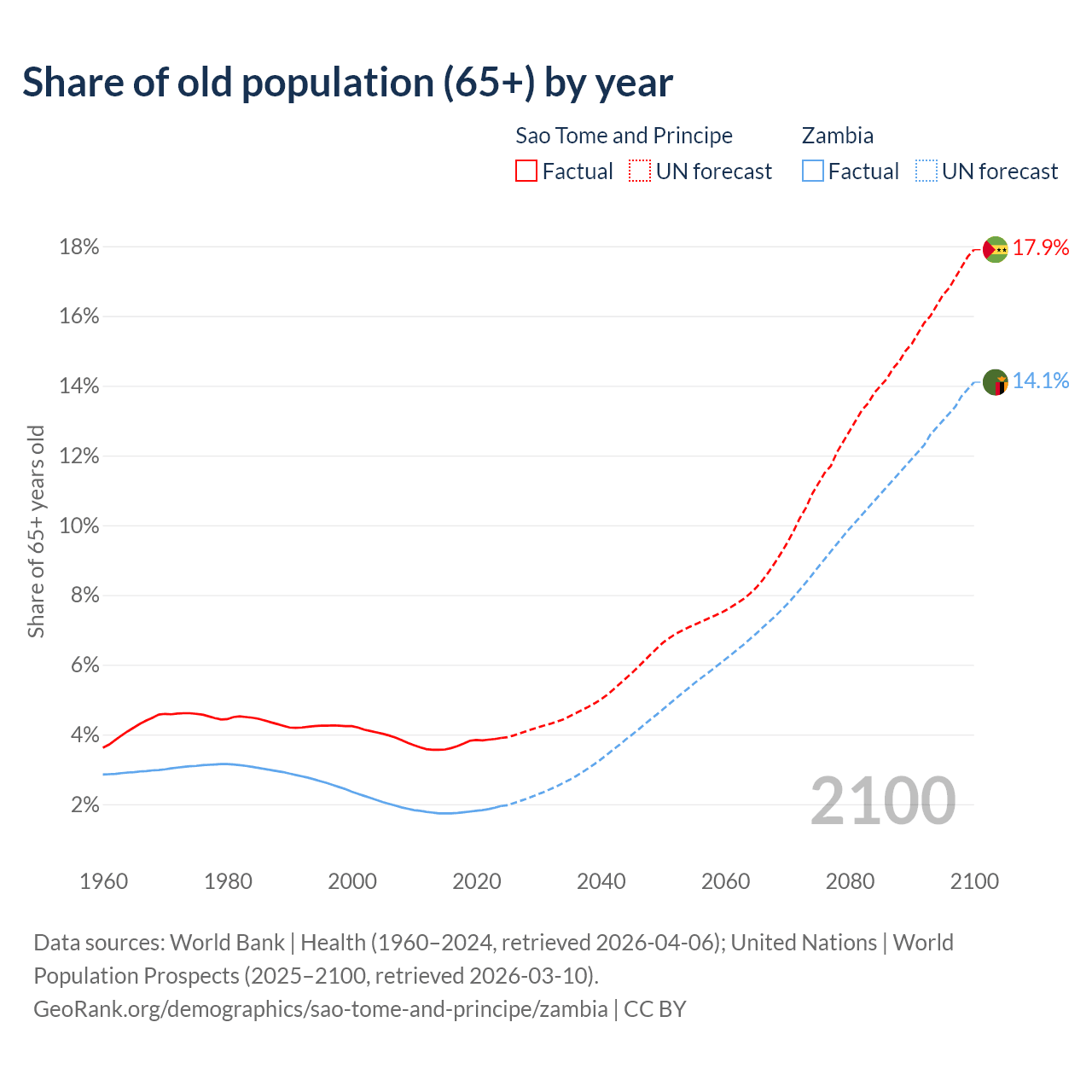 The share of older people aged 65 and over is 3.9% in Sao Tome and Principe and 1.95% in Zambia. Life expectancy in Sao Tome and Principe compared to Zambia .