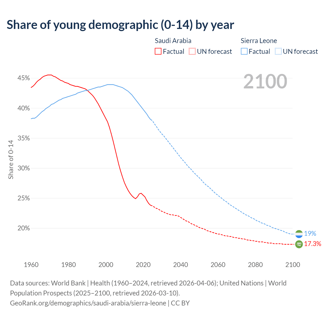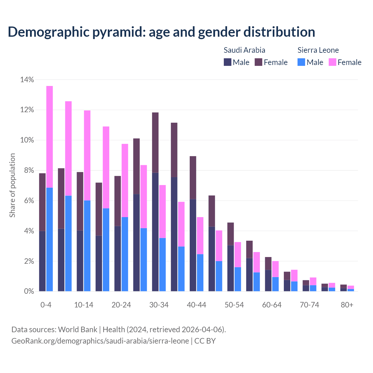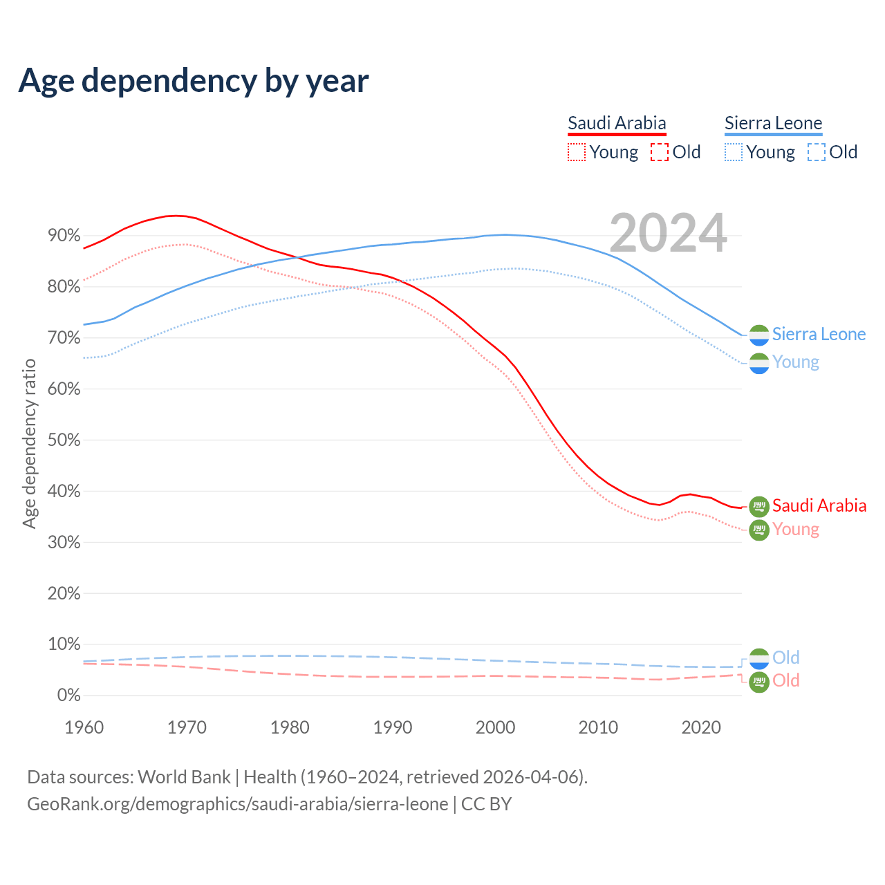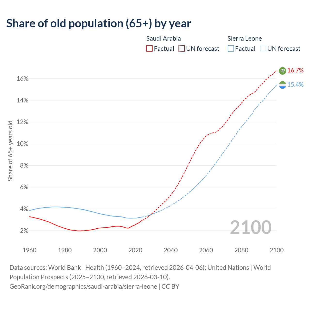 The share of older people aged 65 and over is 2.95% in Saudi Arabia and 3.24% in Sierra Leone. Life expectancy in Saudi Arabia compared to Sierra Leone .