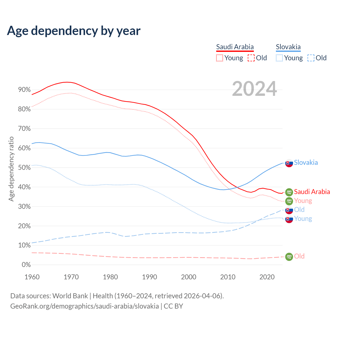 - Saudi Arabia is ranked 98/196 by median age (oldest to youngest) vs 31/196 for Slovakia.