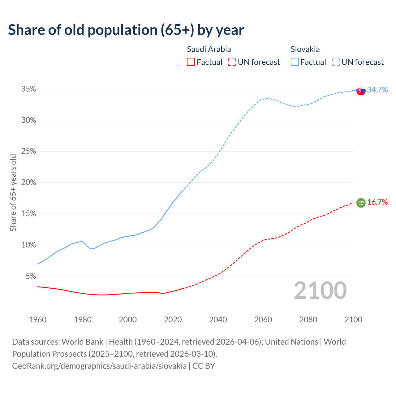 The share of older people aged 65 and over is 2.95% in Saudi Arabia and 18.5% in Slovakia. Life expectancy in Saudi Arabia compared to Slovakia .