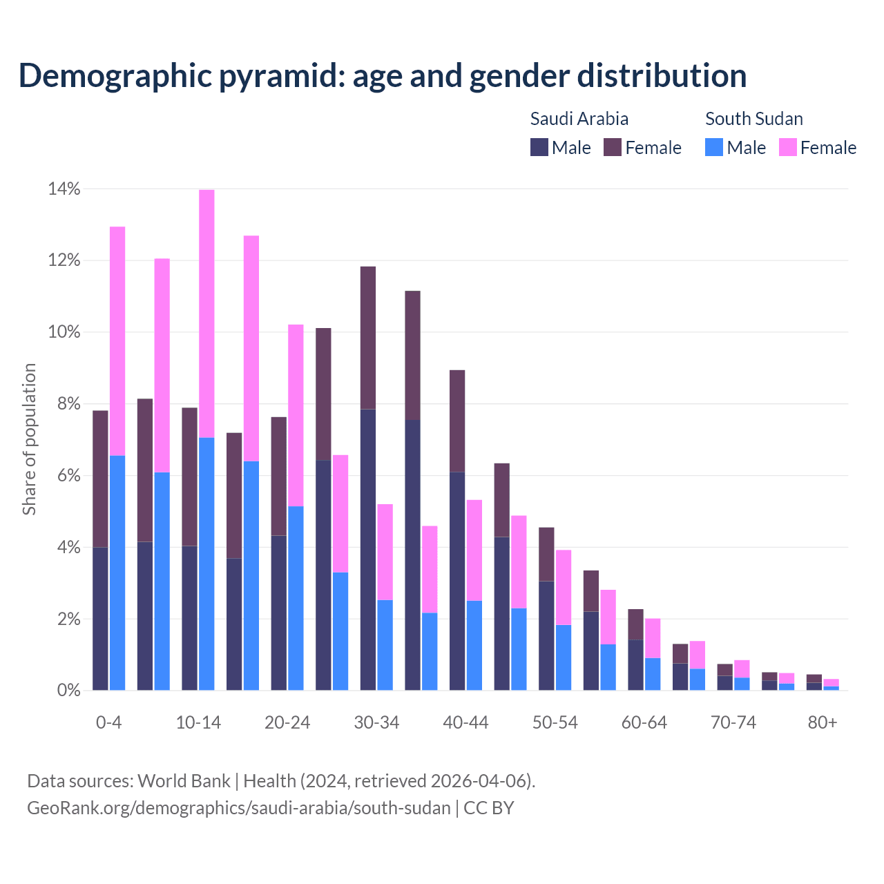 - As of 2026, the population of Saudi Arabia is 36.7M vs 12.5M in South Sudan - 2.94 times difference.