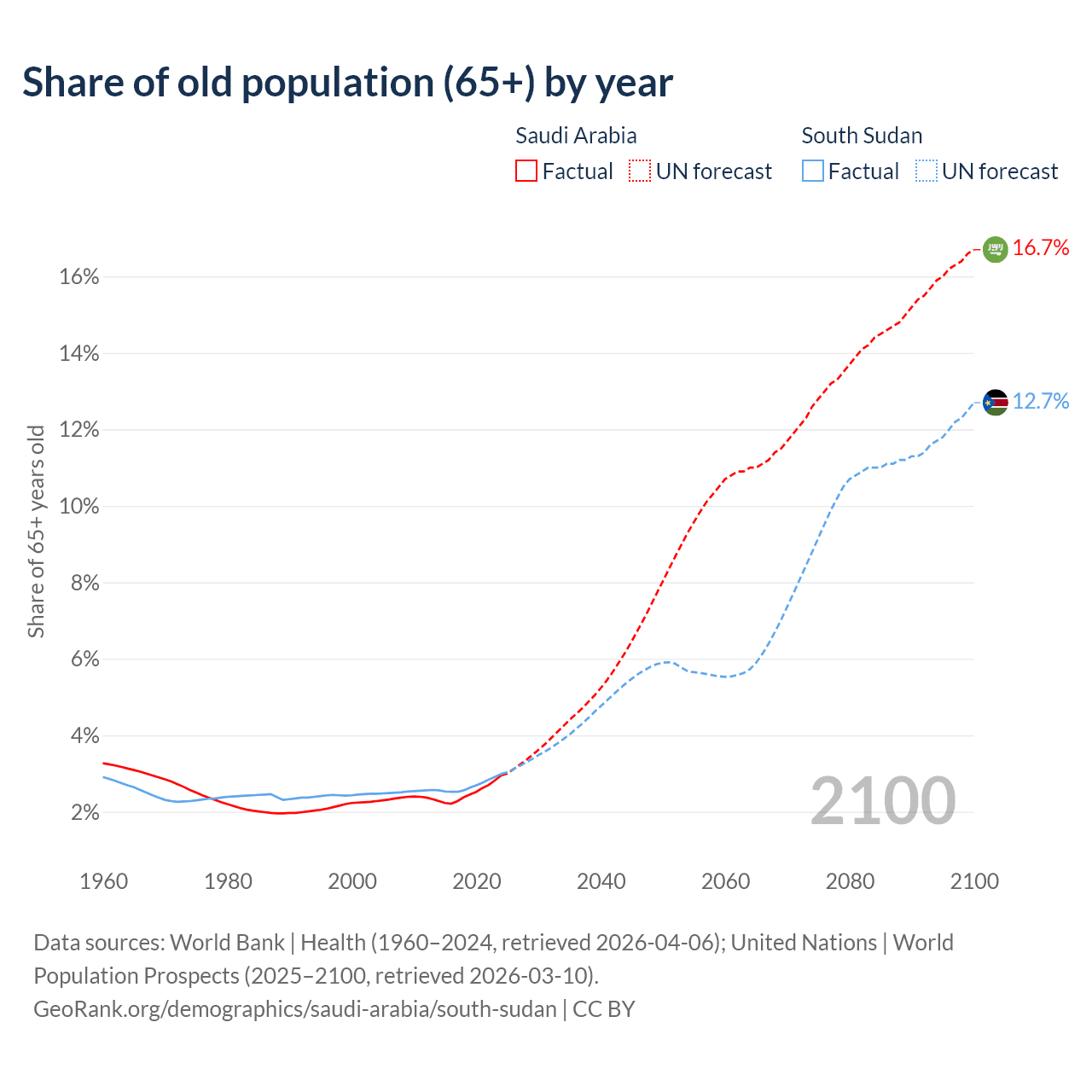 - The share of old-age demographic (65+) in Saudi Arabia is 2.95% vs 2.99% in South Sudan.