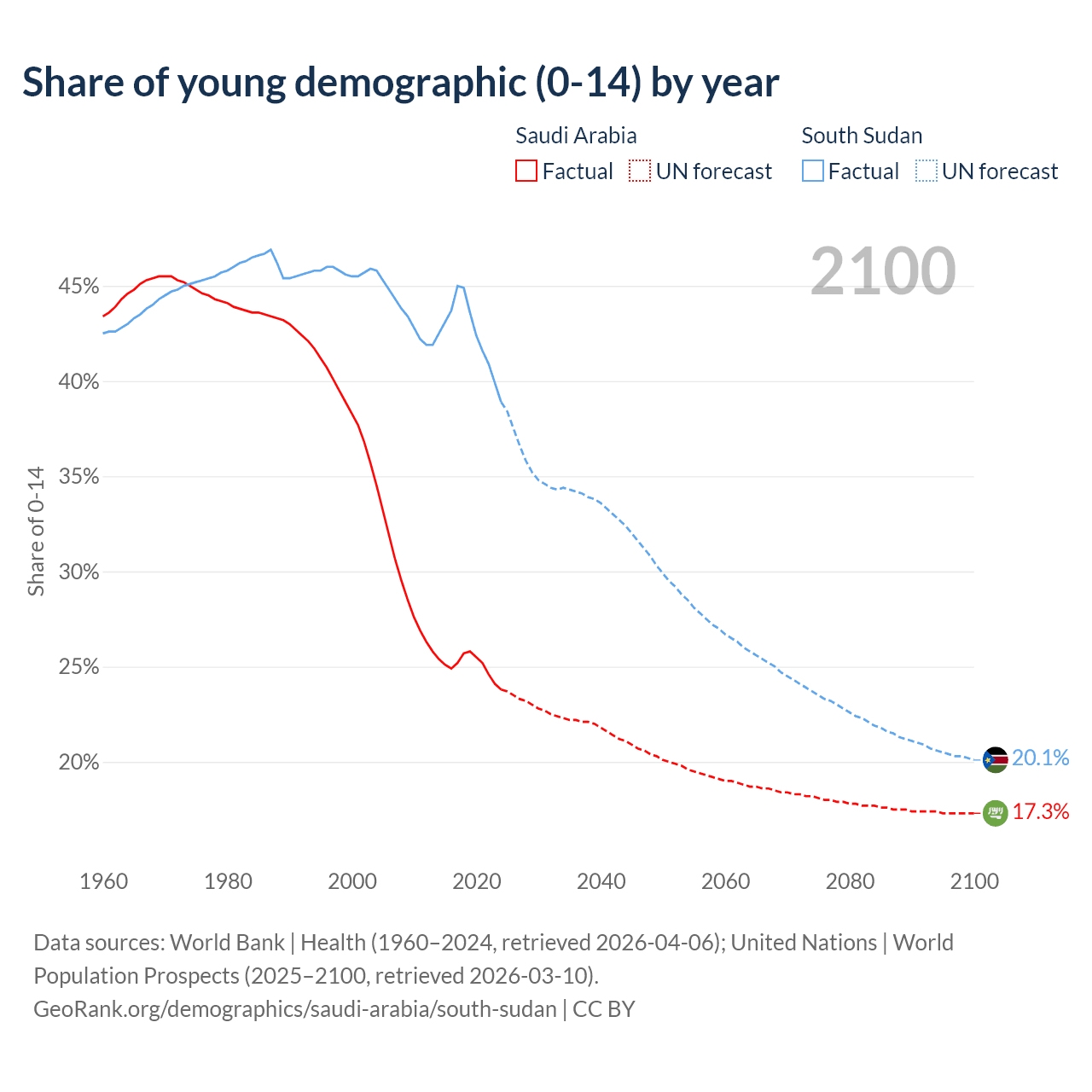 - Saudi Arabia is ranked 98/196 by median age (oldest to youngest) vs 173/196 for South Sudan.
