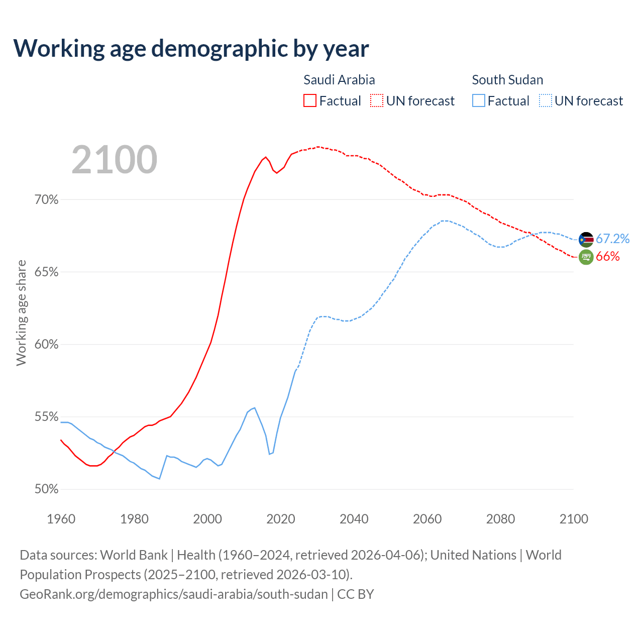 - Saudi Arabia has 26.9M working age adults (aged 15-64) vs 7.27M in South Sudan.