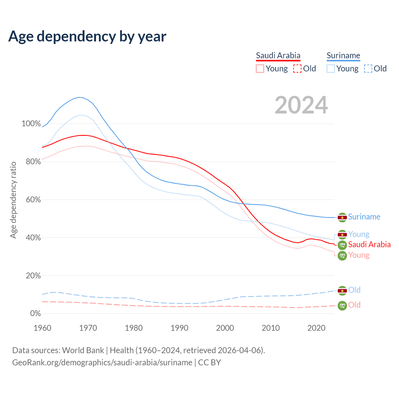 - Saudi Arabia is ranked 98/196 by median age (oldest to youngest) vs 109/196 for Suriname.