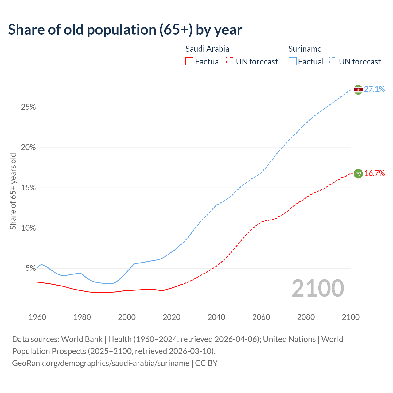 The share of older people aged 65 and over is 2.95% in Saudi Arabia and 7.9% in Suriname. Life expectancy in Saudi Arabia compared to Suriname .