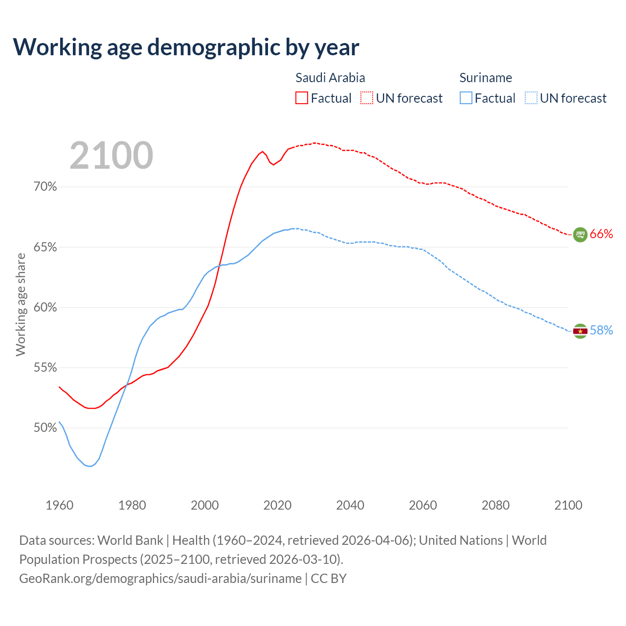 - The share of young demographic (0-15 years old) in Saudi Arabia is 23.8% vs 25.6% in Suriname.