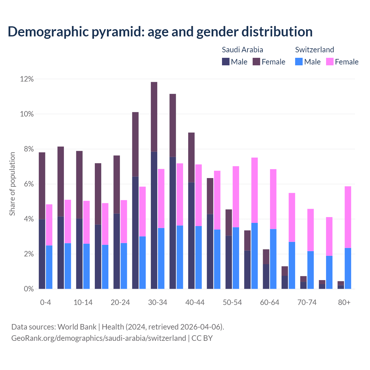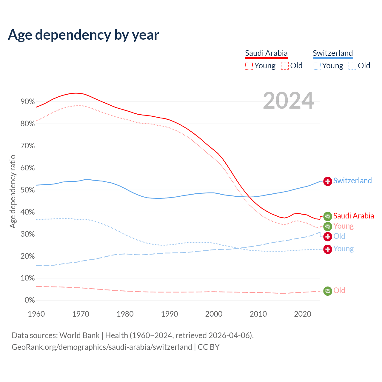 - Saudi Arabia is ranked 98/196 by median age (oldest to youngest) vs 24/196 for Switzerland.