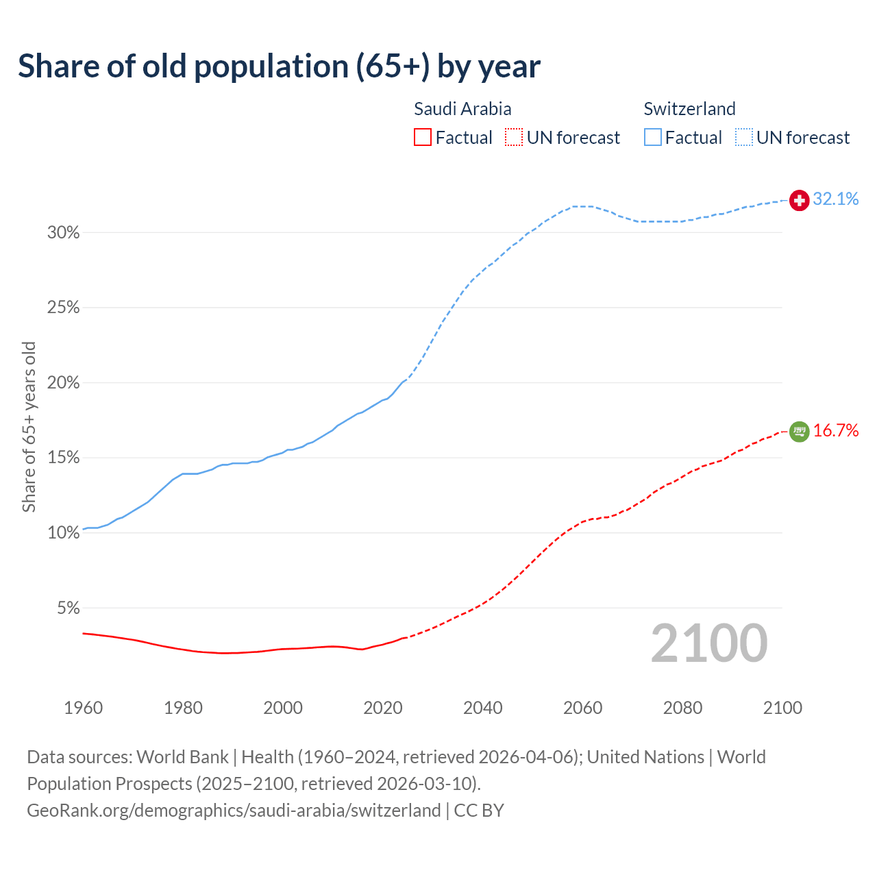 The share of older people aged 65 and over is 2.95% in Saudi Arabia and 20% in Switzerland. Life expectancy in Saudi Arabia compared to Switzerland .