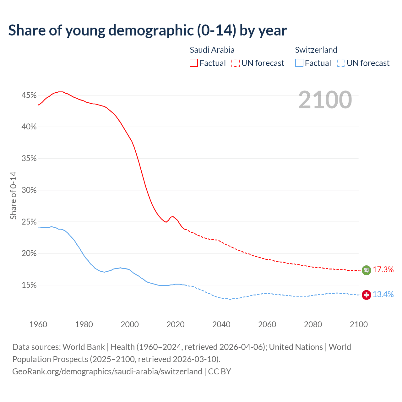 - The share of young demographic (0-15 years old) in Saudi Arabia is 23.8% vs 15% in Switzerland.