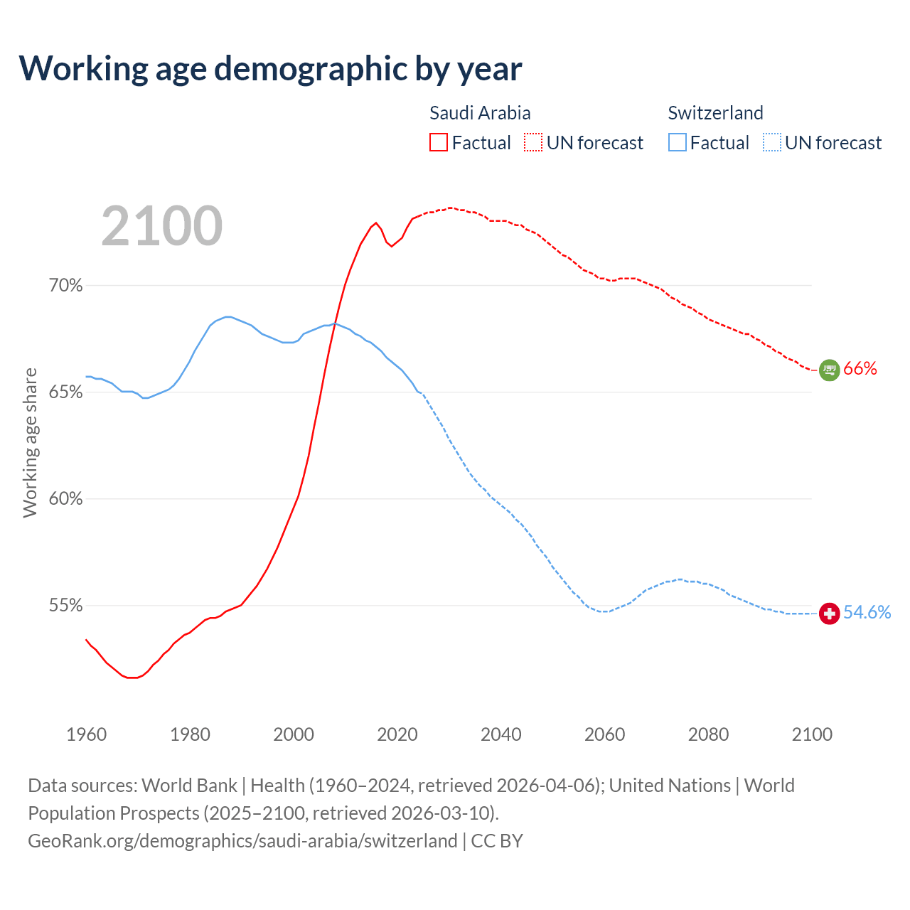 - Saudi Arabia has 26.9M working age adults (aged 15-64) vs 5.92M in Switzerland.