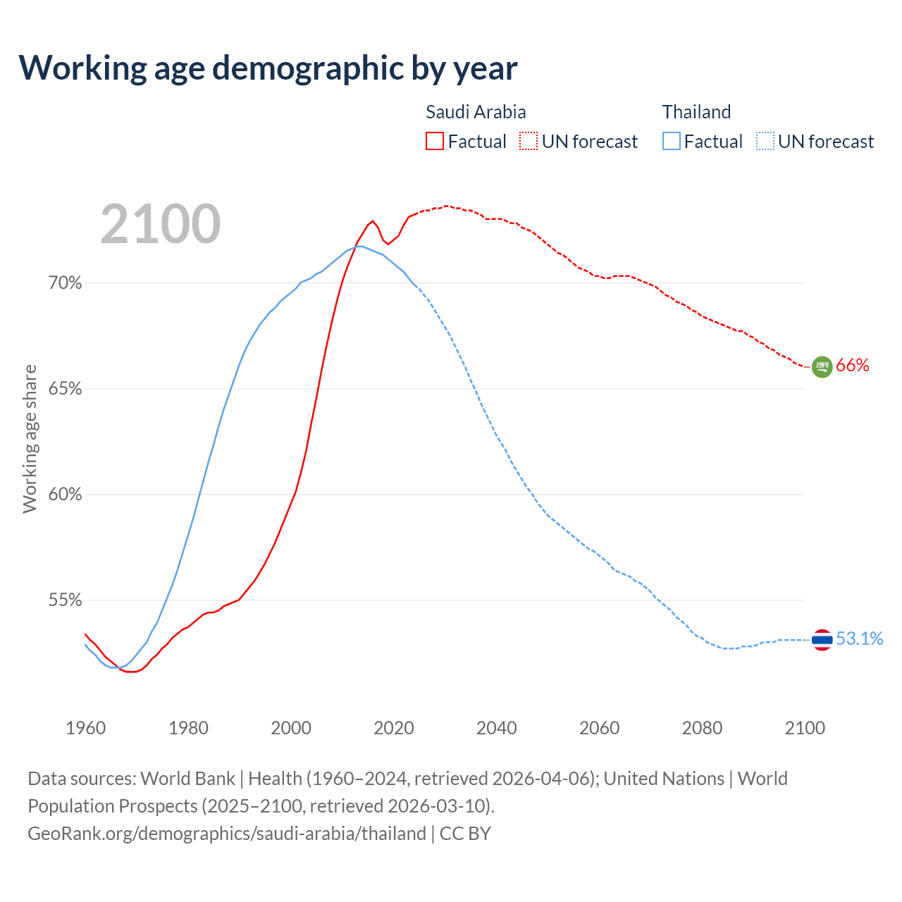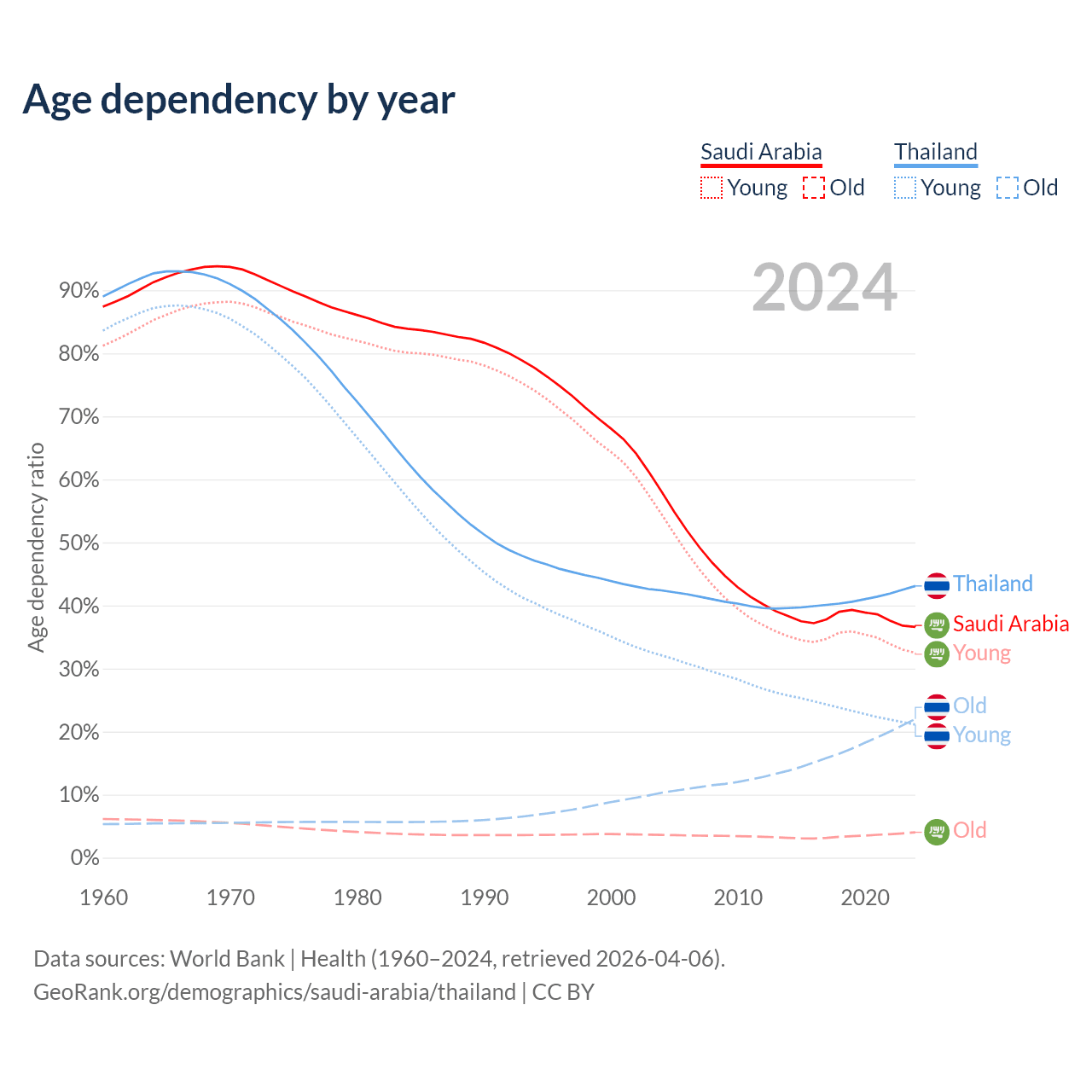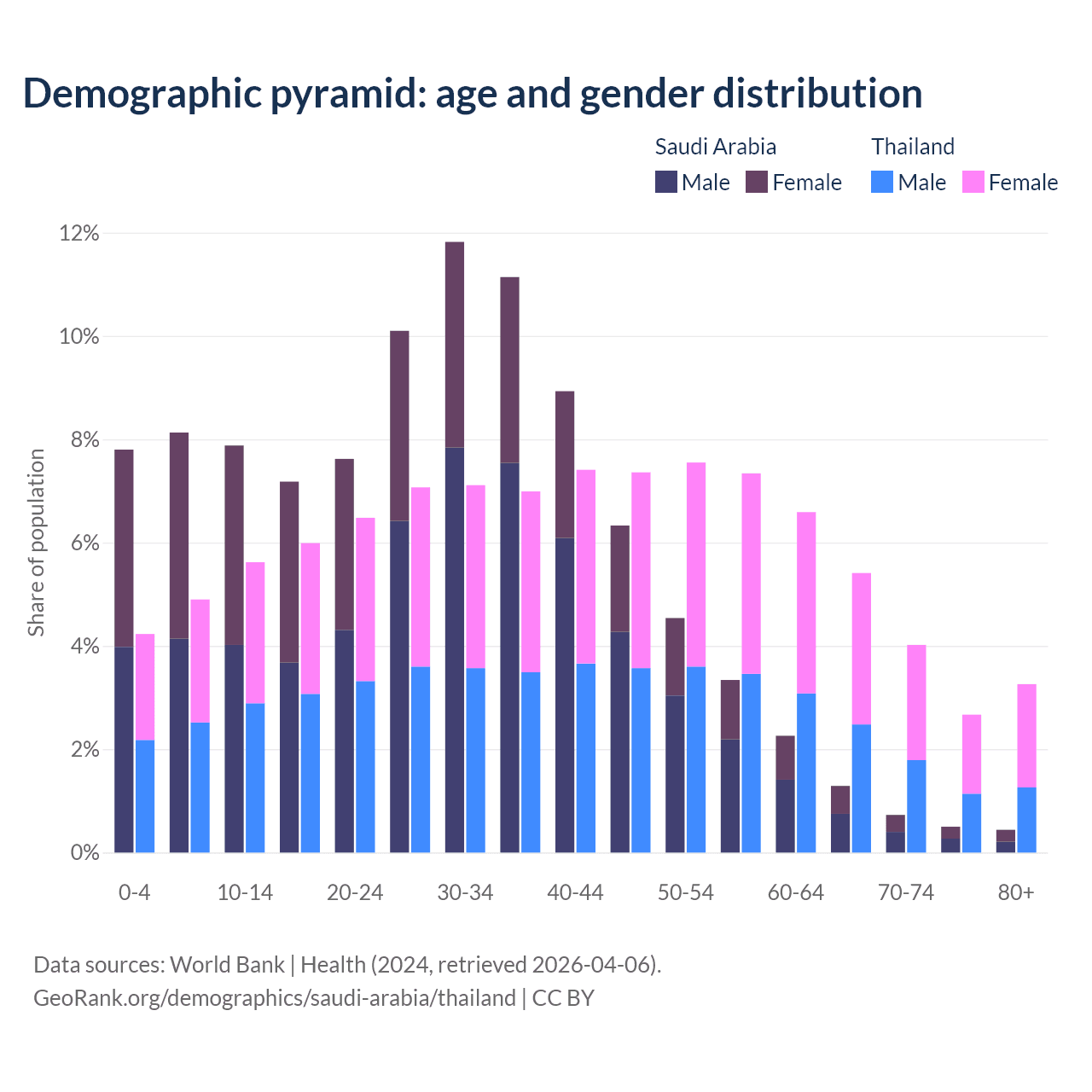 - Saudi Arabia is ranked 98/196 by median age (oldest to youngest) vs 40/196 for Thailand.