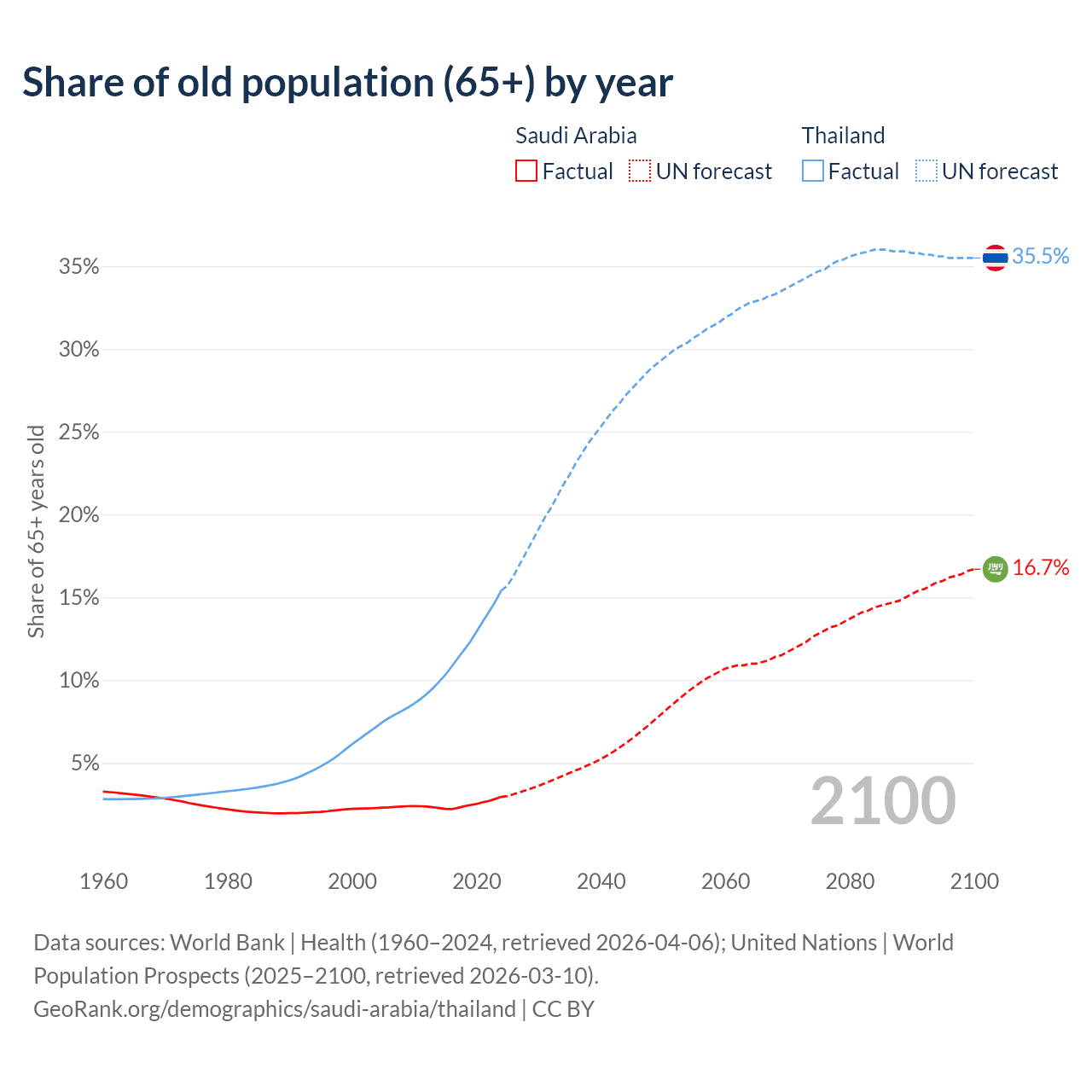 The share of older people aged 65 and over is 2.95% in Saudi Arabia and 15.4% in Thailand. Life expectancy in Saudi Arabia compared to Thailand .