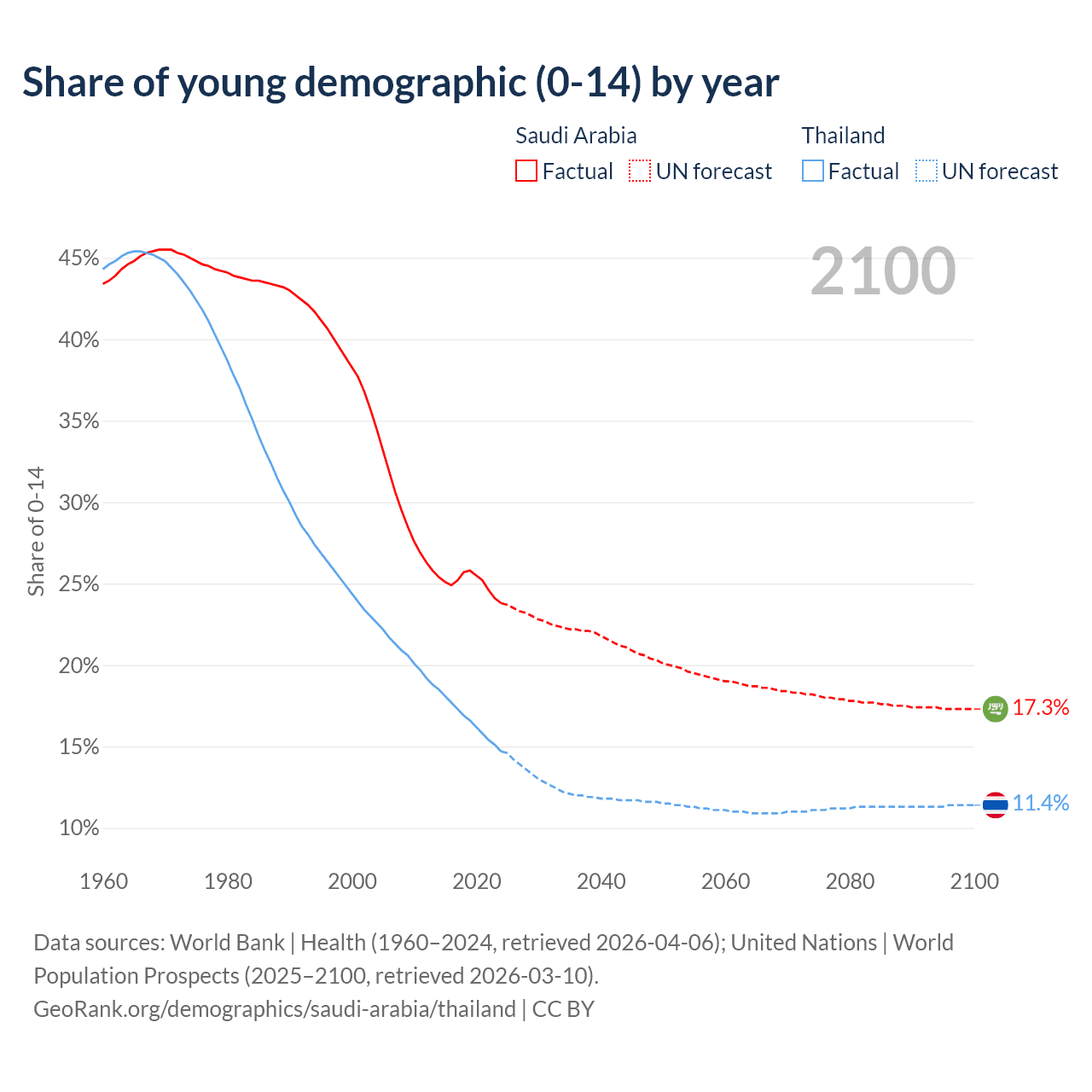 - The total fertility rate is 2.28 in Saudi Arabia compared to 1.21 in Thailand.