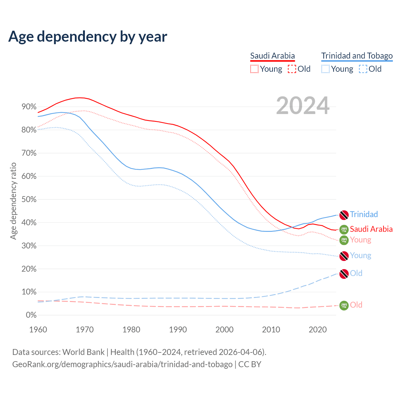 - Saudi Arabia is ranked 98/196 by median age (oldest to youngest) vs 58/196 for Trinidad and Tobago.