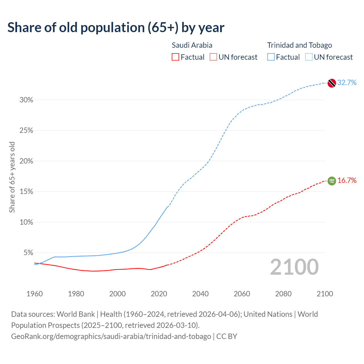 The share of older people aged 65 and over is 2.95% in Saudi Arabia and 12.4% in Trinidad and Tobago. Life expectancy in Saudi Arabia compared to Trinidad and Tobago .
