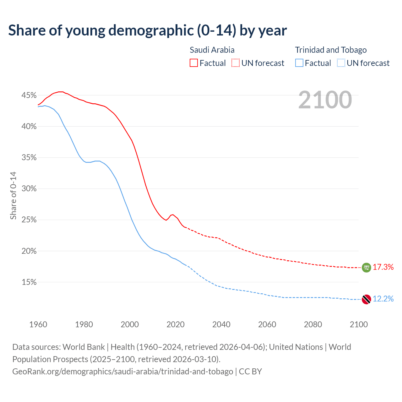 - The share of young demographic (0-15 years old) in Saudi Arabia is 23.8% vs 17.8% in Trinidad and Tobago.