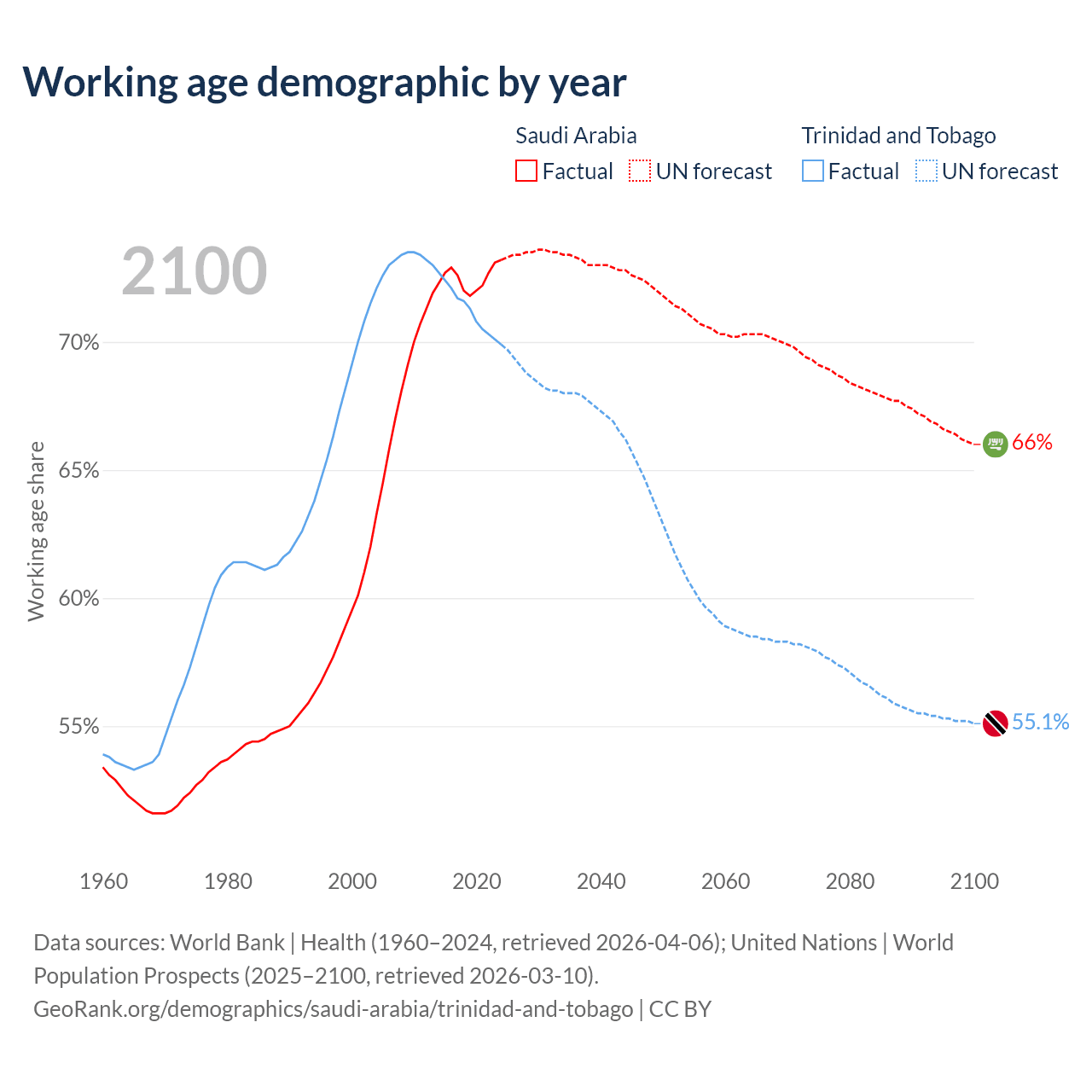 - Saudi Arabia has 26.9M working age adults (aged 15-64) vs 960K in Trinidad and Tobago.