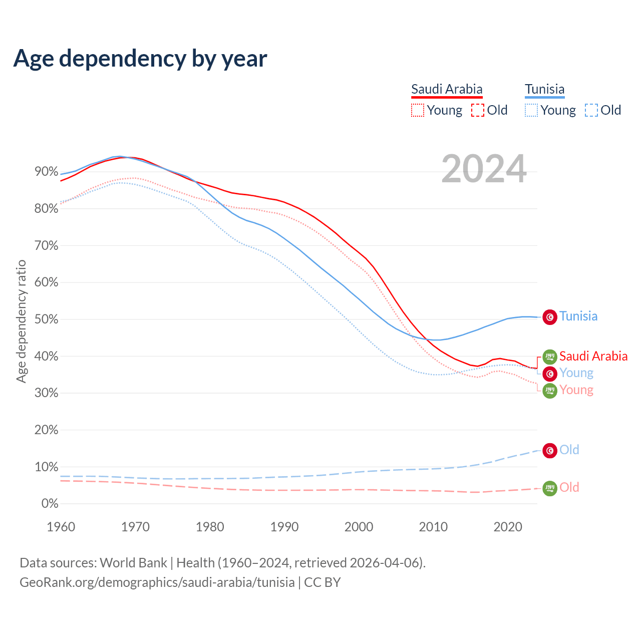- Saudi Arabia is ranked 98/196 by median age (oldest to youngest) vs 86/196 for Tunisia.