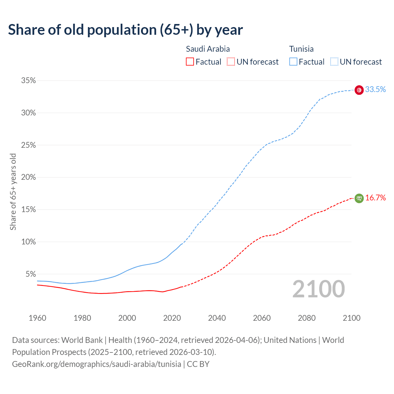 The share of older people aged 65 and over is 2.95% in Saudi Arabia and 9.53% in Tunisia. Life expectancy in Saudi Arabia compared to Tunisia .