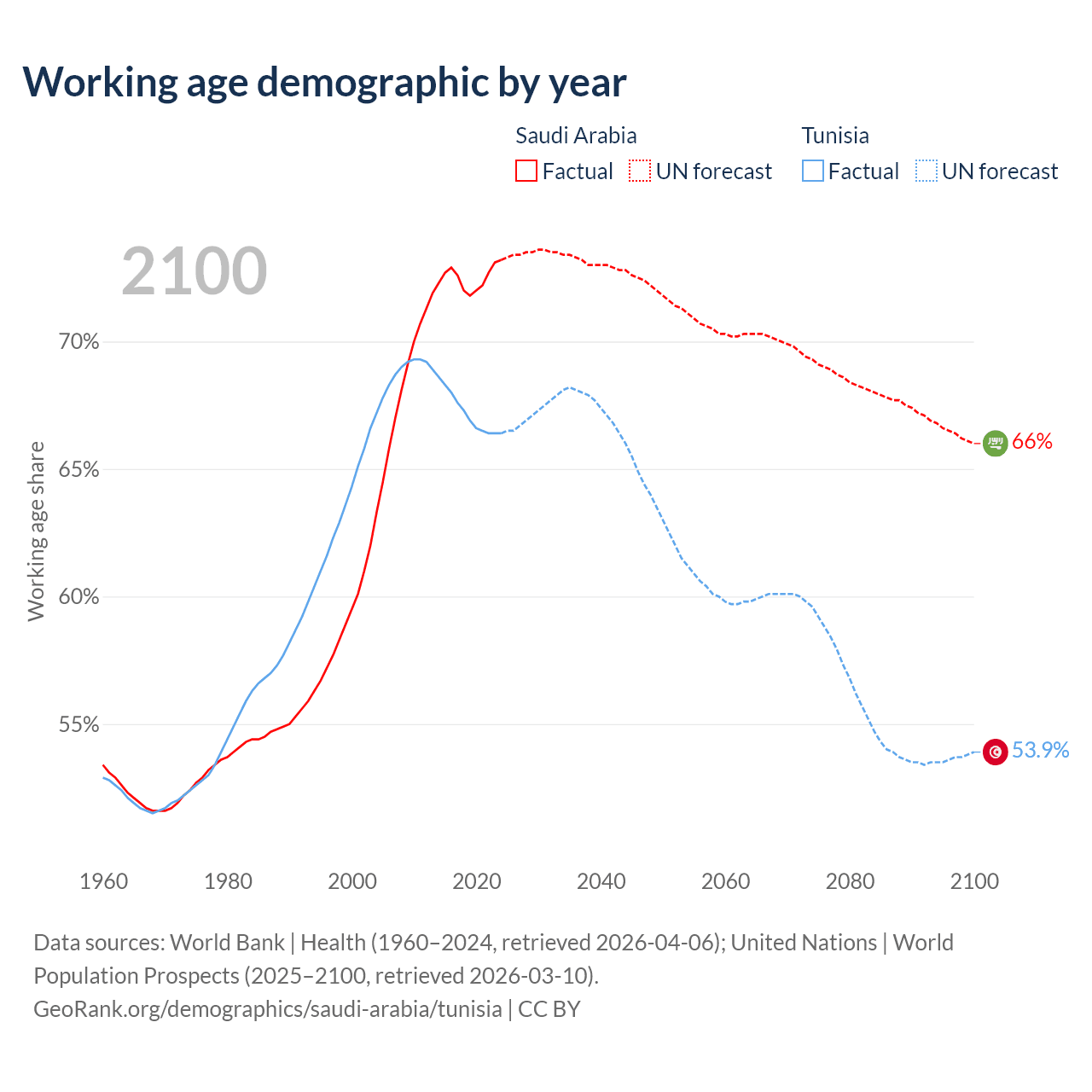 Median age Saudi Arabia vs Tunisia, 1960-2100