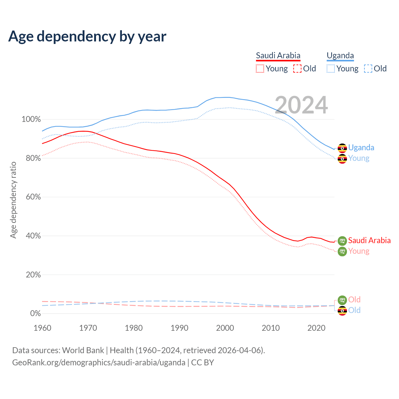 - Saudi Arabia is ranked 98/196 by median age (oldest to youngest) vs 187/196 for Uganda.