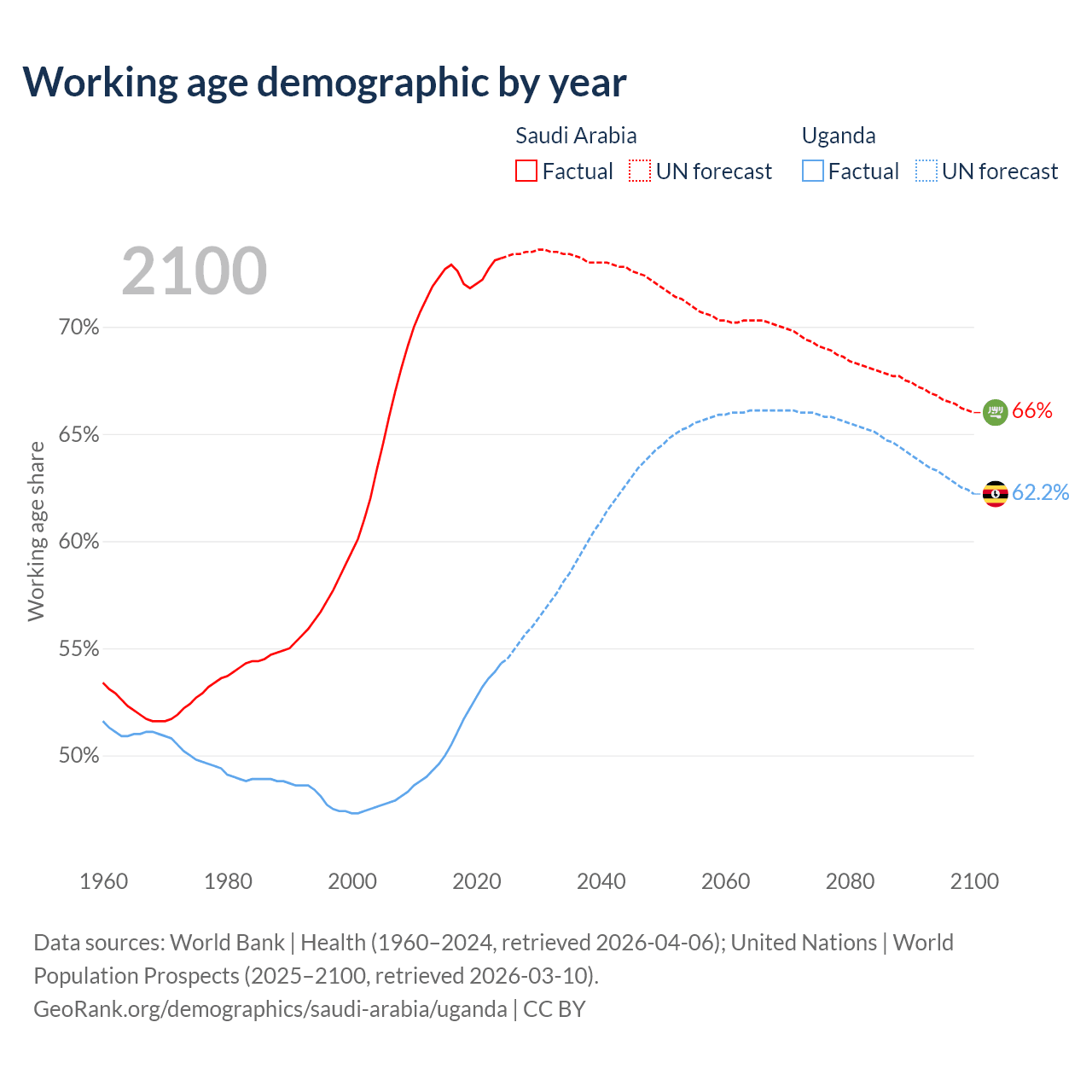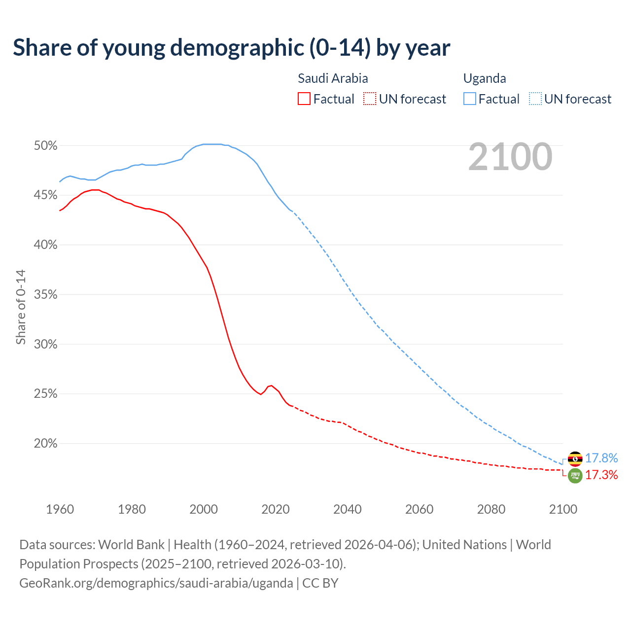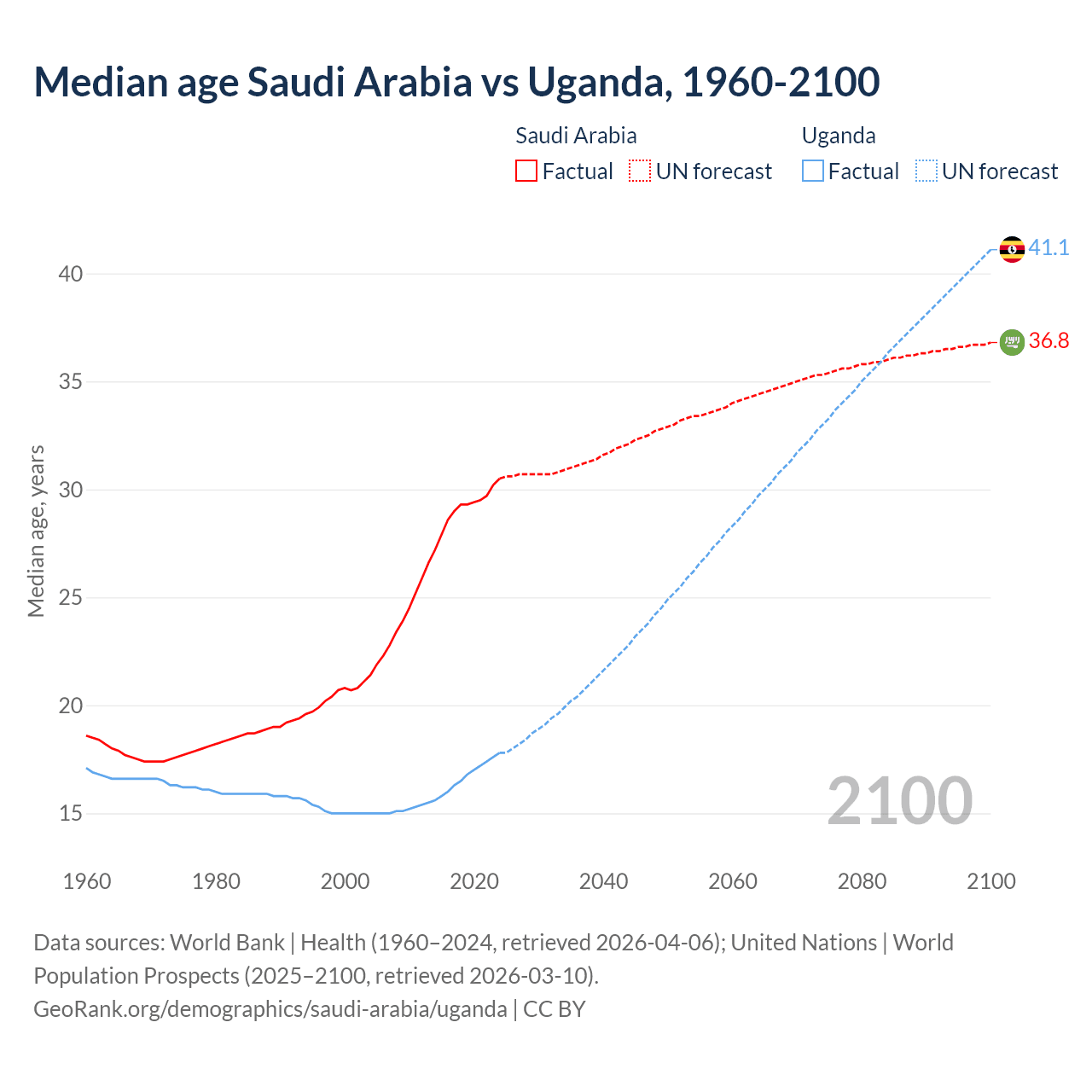 Median age Saudi Arabia vs Uganda, 1960-2100