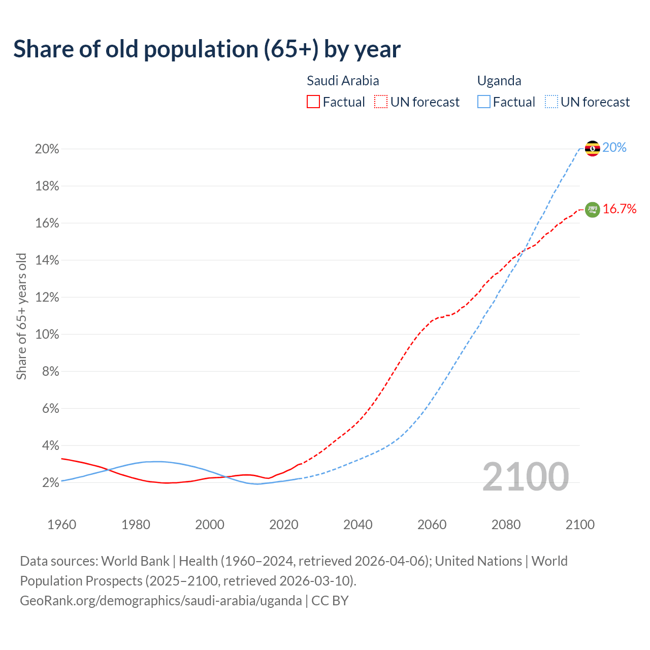 The share of older people aged 65 and over is 2.95% in Saudi Arabia and 2.19% in Uganda. Life expectancy in Saudi Arabia compared to Uganda .