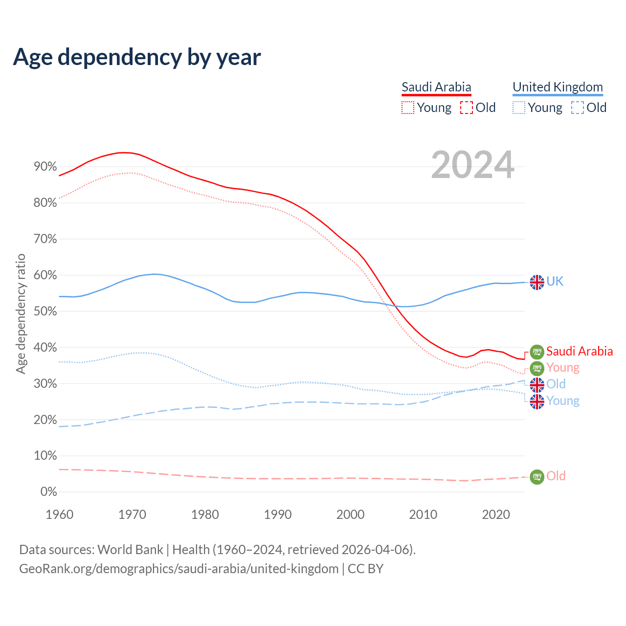 - Saudi Arabia is ranked 98/196 by median age (oldest to youngest) vs 41/196 for the United Kingdom.