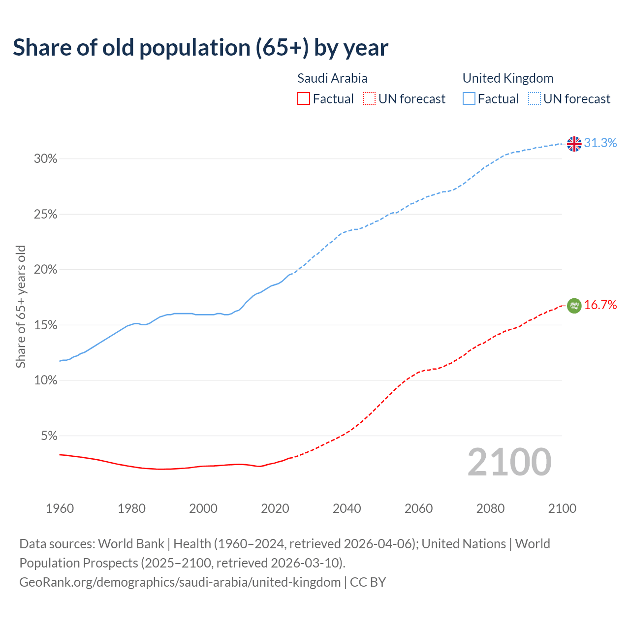 The share of older people aged 65 and over is 2.95% in Saudi Arabia and 19.5% in the United Kingdom. Life expectancy in Saudi Arabia compared to the United Kingdom .