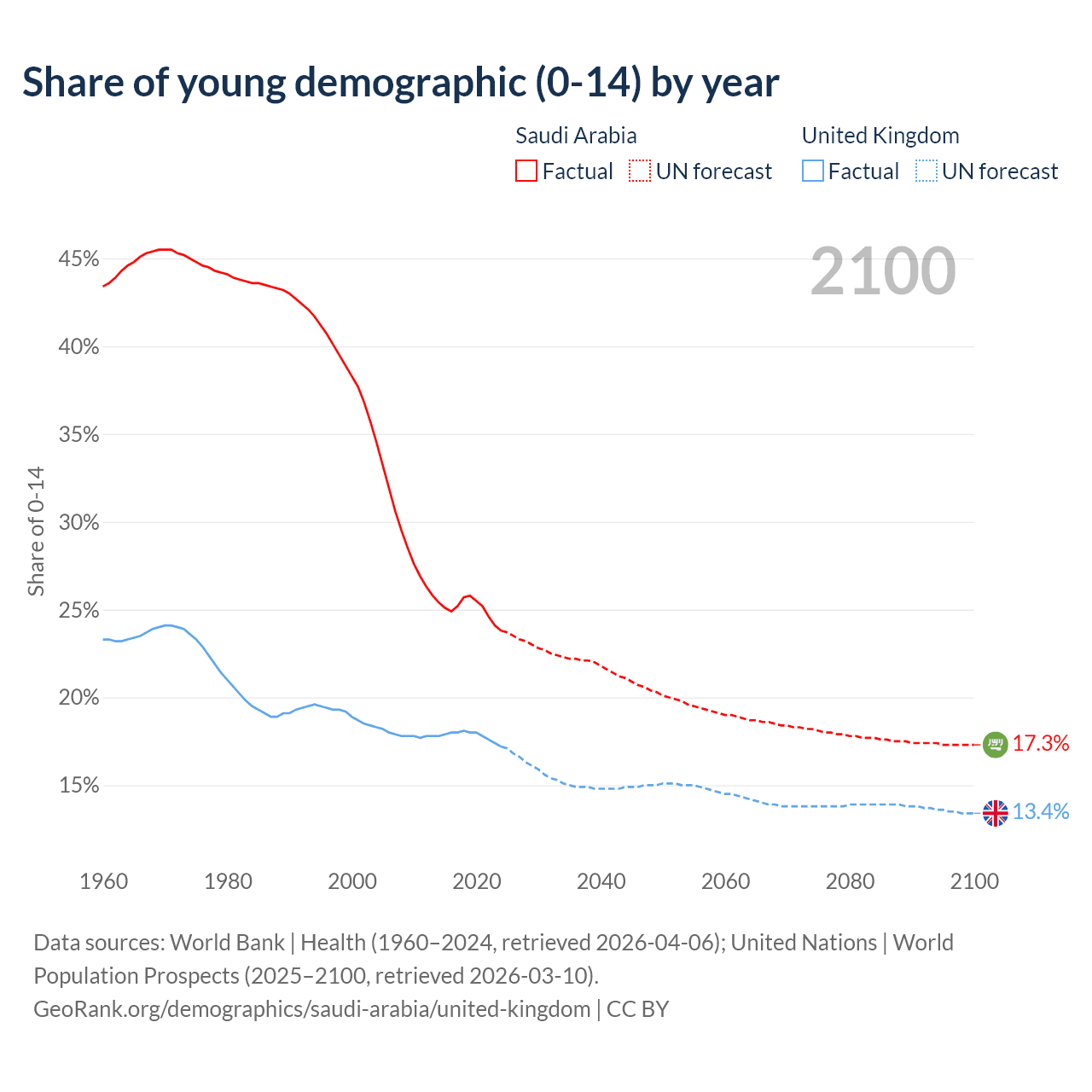 - The share of young demographic (0-15 years old) in Saudi Arabia is 23.8% vs 17.2% in the United Kingdom.