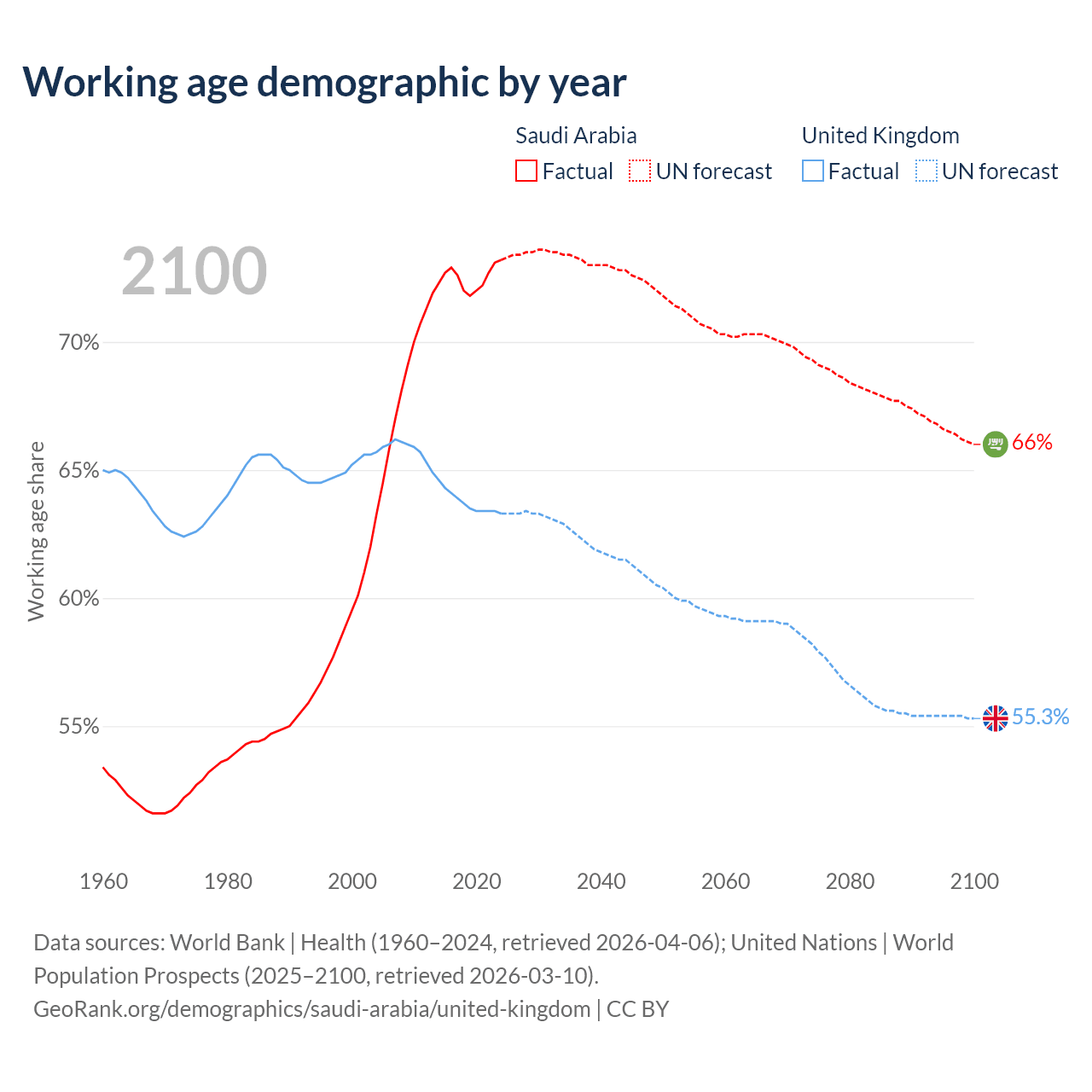 - Saudi Arabia has 26.9M working age adults (aged 15-64) vs 44.4M in the United Kingdom.