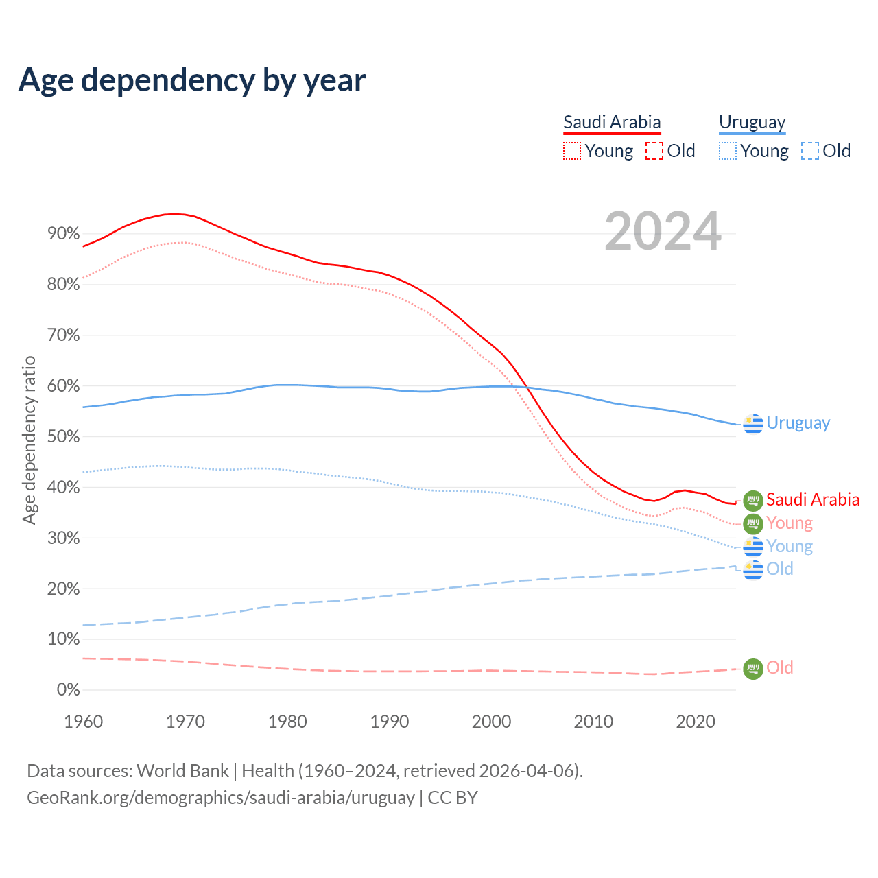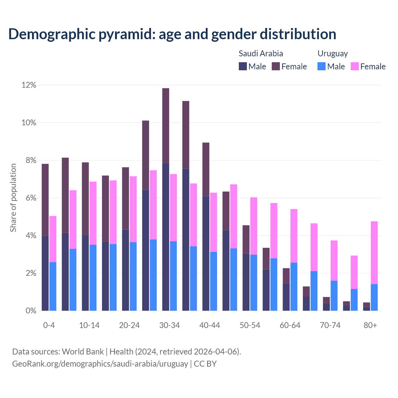 - Saudi Arabia is ranked 98/196 by median age (oldest to youngest) vs 63/196 for Uruguay.