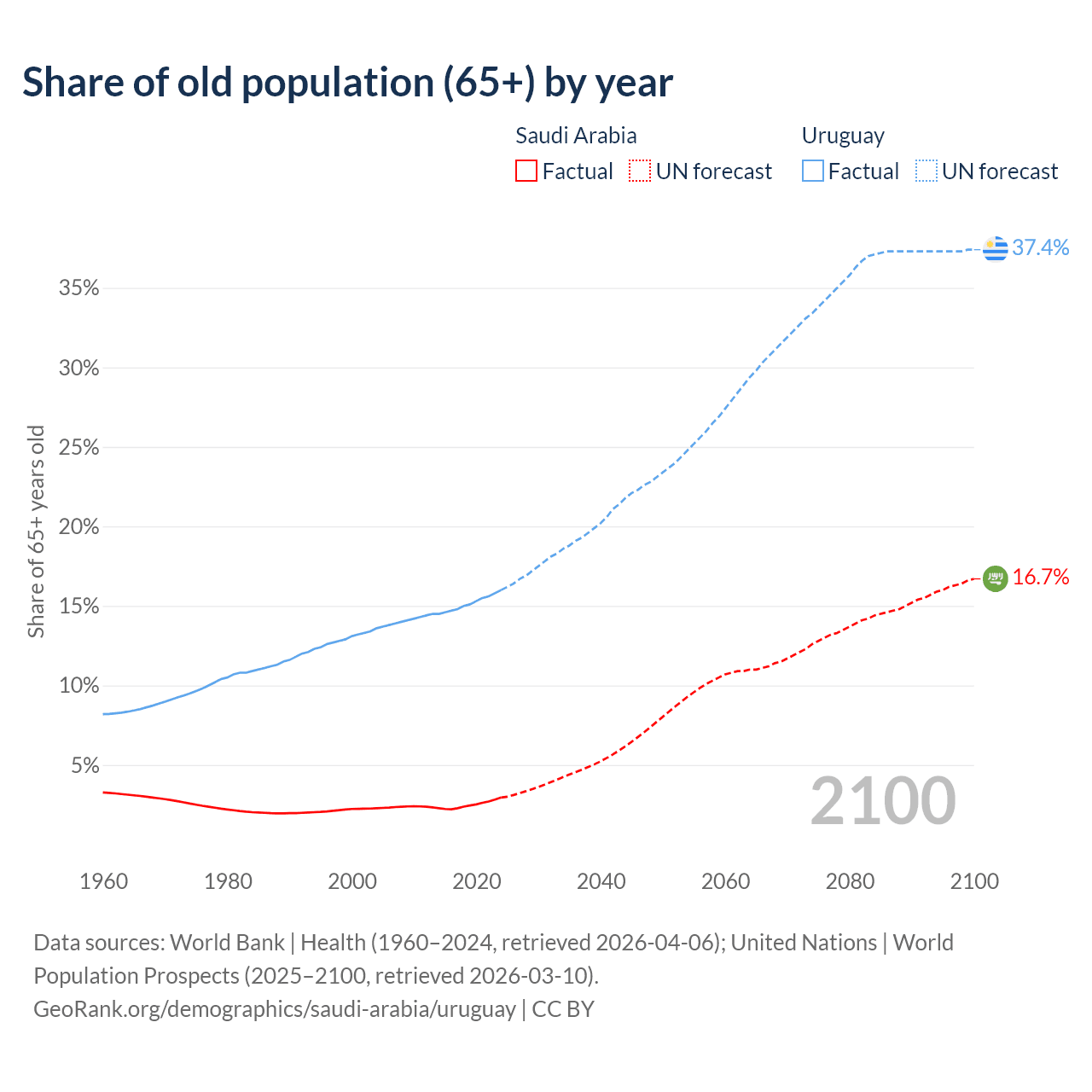 The share of older people aged 65 and over is 2.95% in Saudi Arabia and 16% in Uruguay. Life expectancy in Saudi Arabia compared to Uruguay .