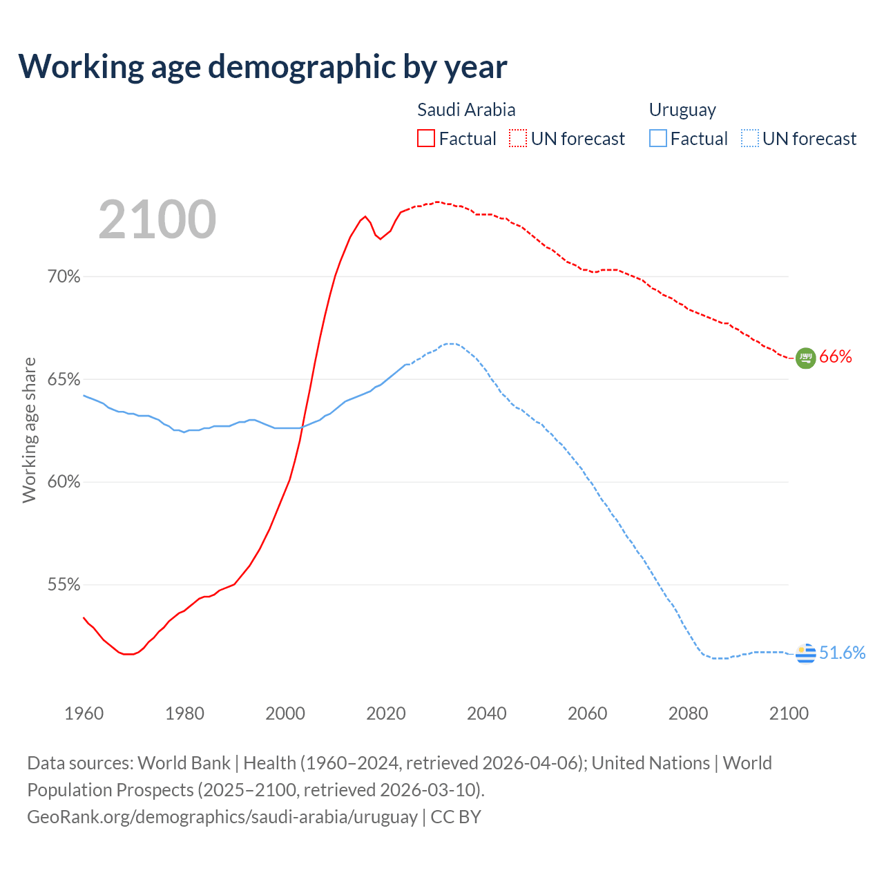 - Saudi Arabia has 26.9M working age adults (aged 15-64) vs 2.22M in Uruguay.
