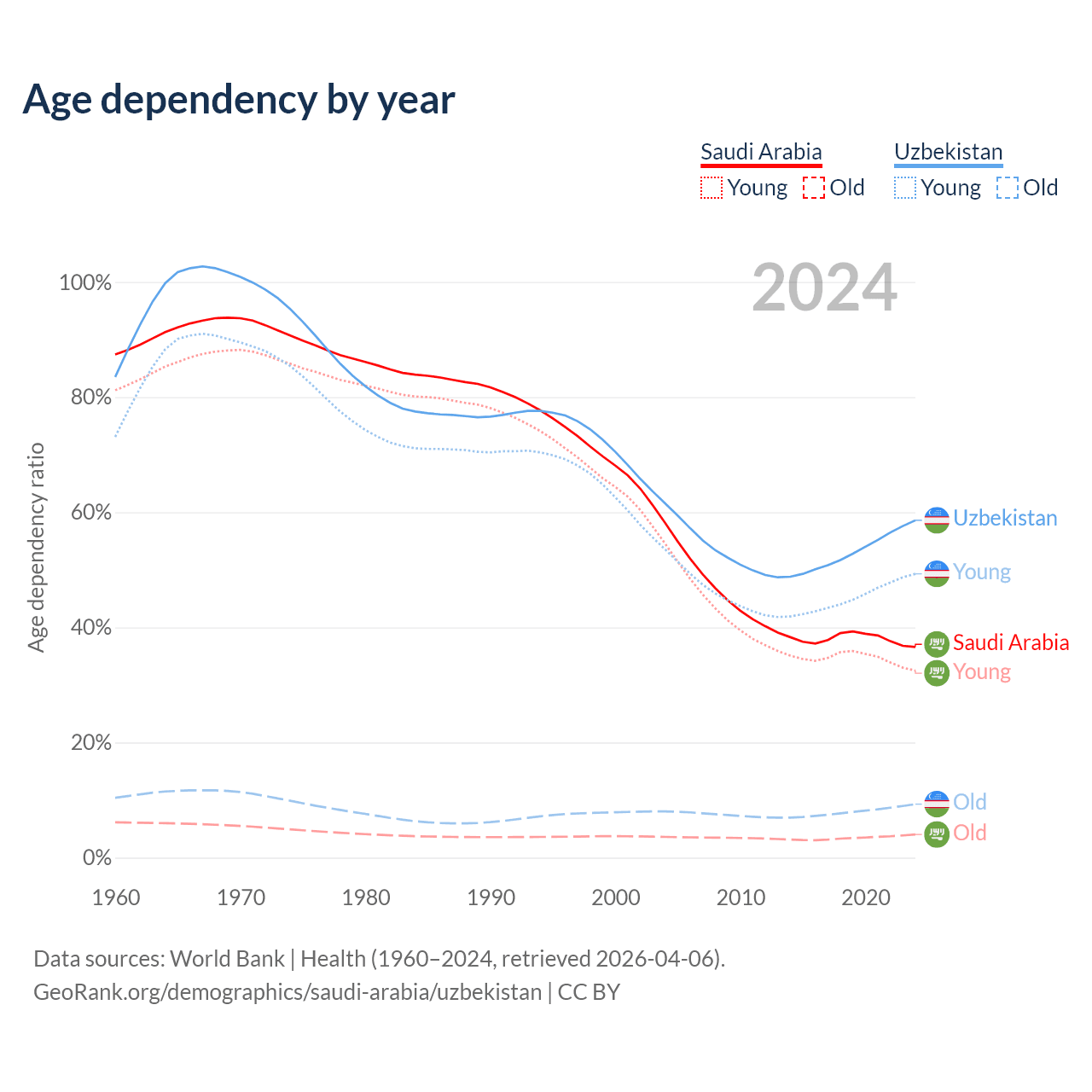 The share of older people aged 65 and over is 2.95% in Saudi Arabia and 5.86% in Uzbekistan. Life expectancy in Saudi Arabia compared to Uzbekistan .