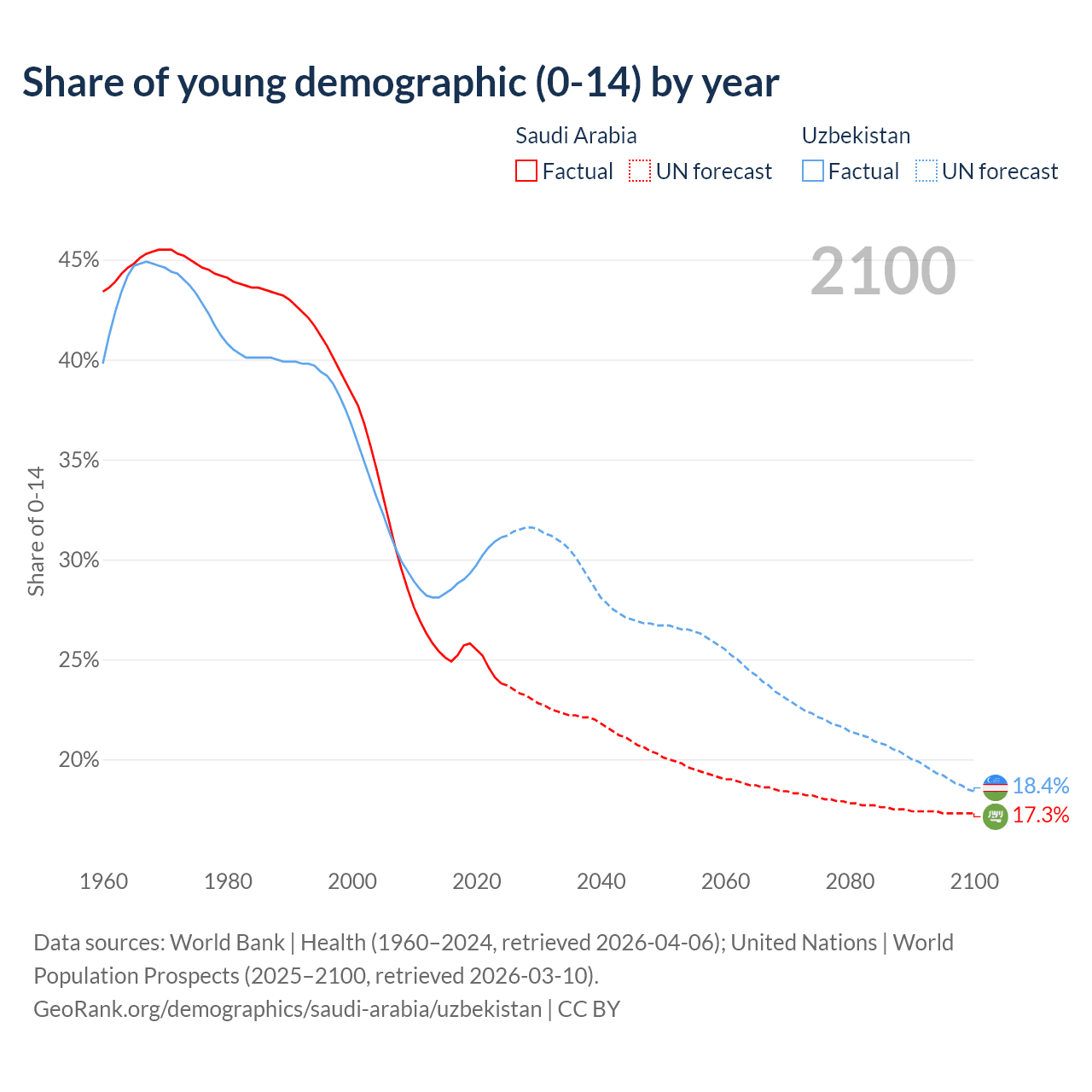 Median age Saudi Arabia vs Uzbekistan, 1960-2100