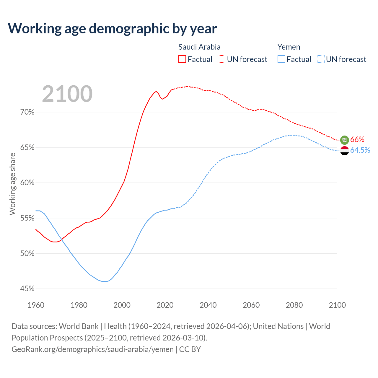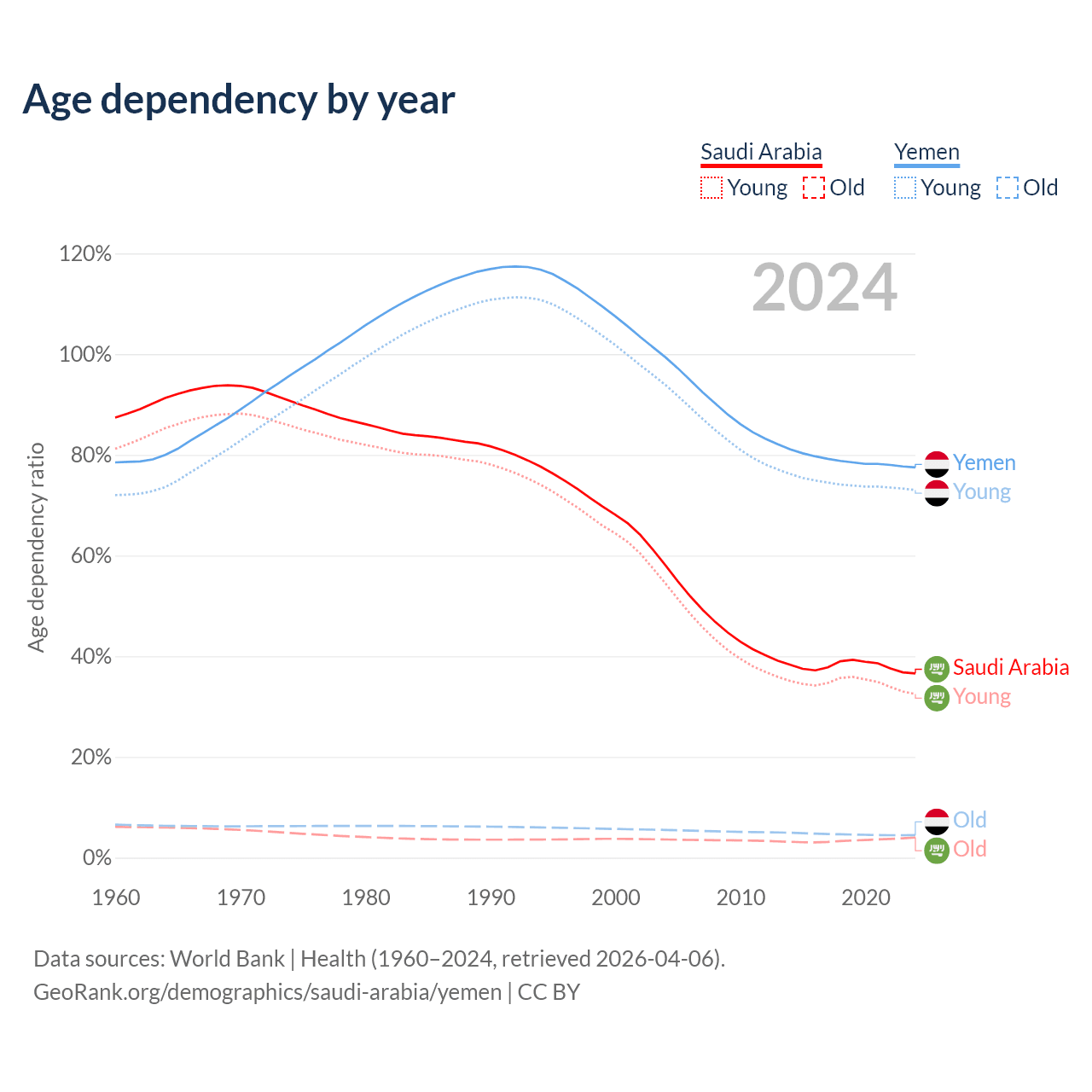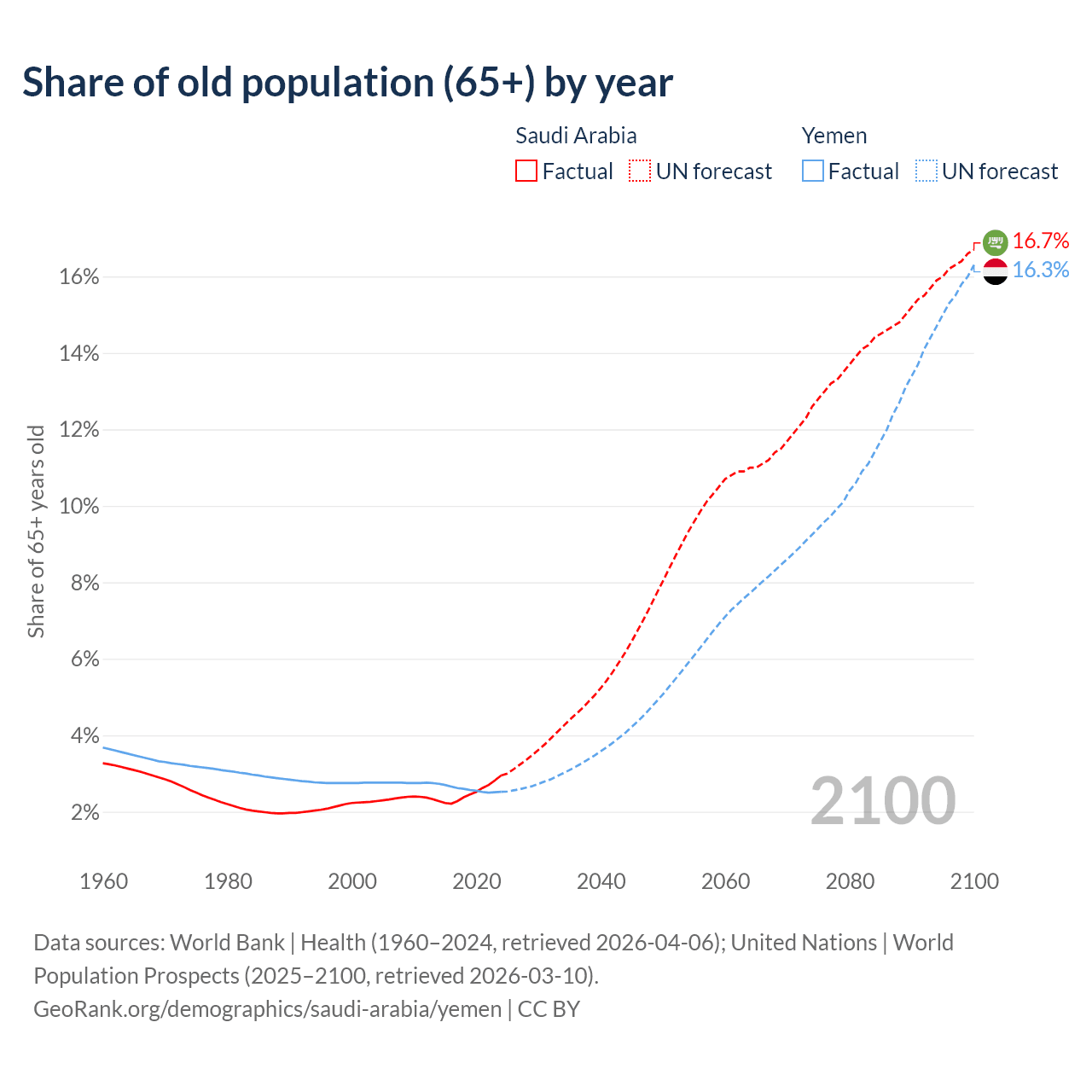 The share of older people aged 65 and over is 2.95% in Saudi Arabia and 2.52% in Yemen. Life expectancy in Saudi Arabia compared to Yemen .