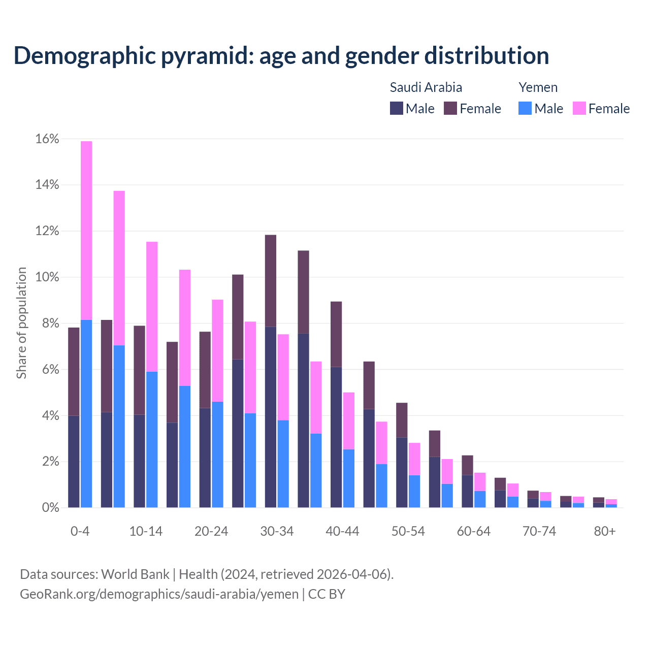 - Saudi Arabia is ranked 98/196 by median age (oldest to youngest) vs 174/196 for Yemen.