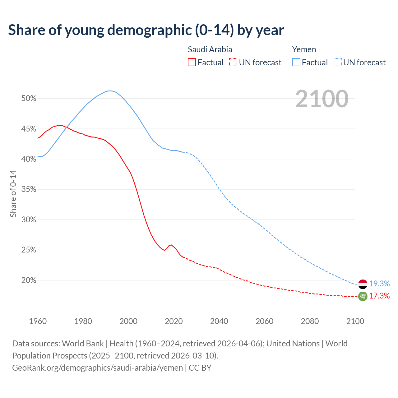 Median age Saudi Arabia vs Yemen, 1960-2100