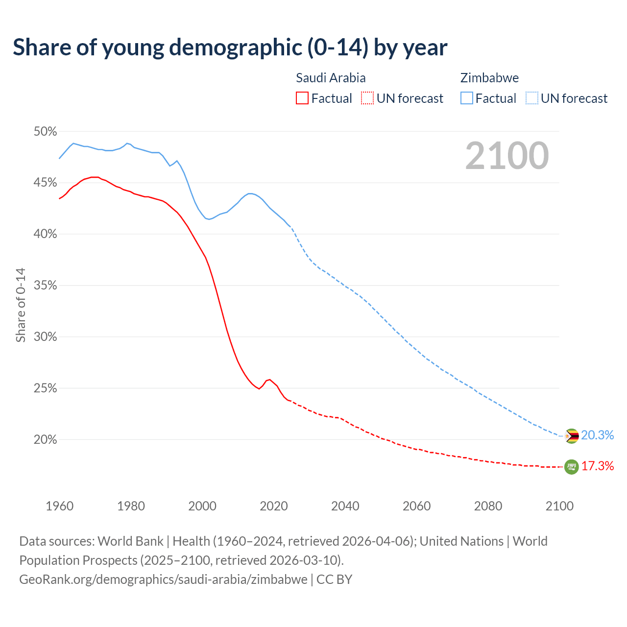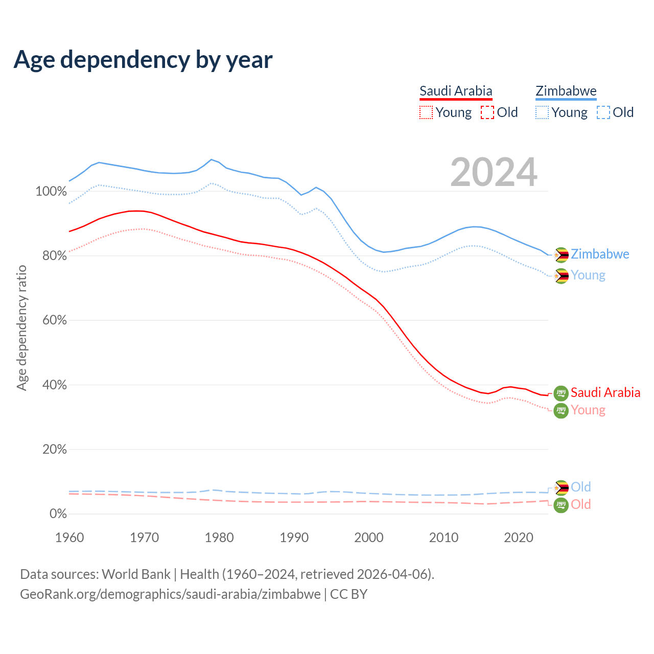 - Saudi Arabia is ranked 98/196 by median age (oldest to youngest) vs 177/196 for Zimbabwe.