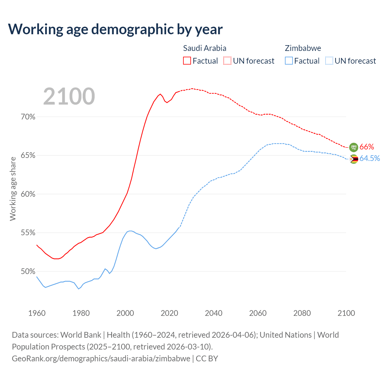 - Saudi Arabia has 26.9M working age adults (aged 15-64) vs 9.64M in Zimbabwe.
