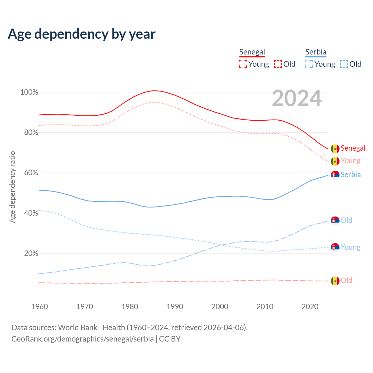 - Senegal is ranked 162/196 by median age (oldest to youngest) vs 15/196 for Serbia.
