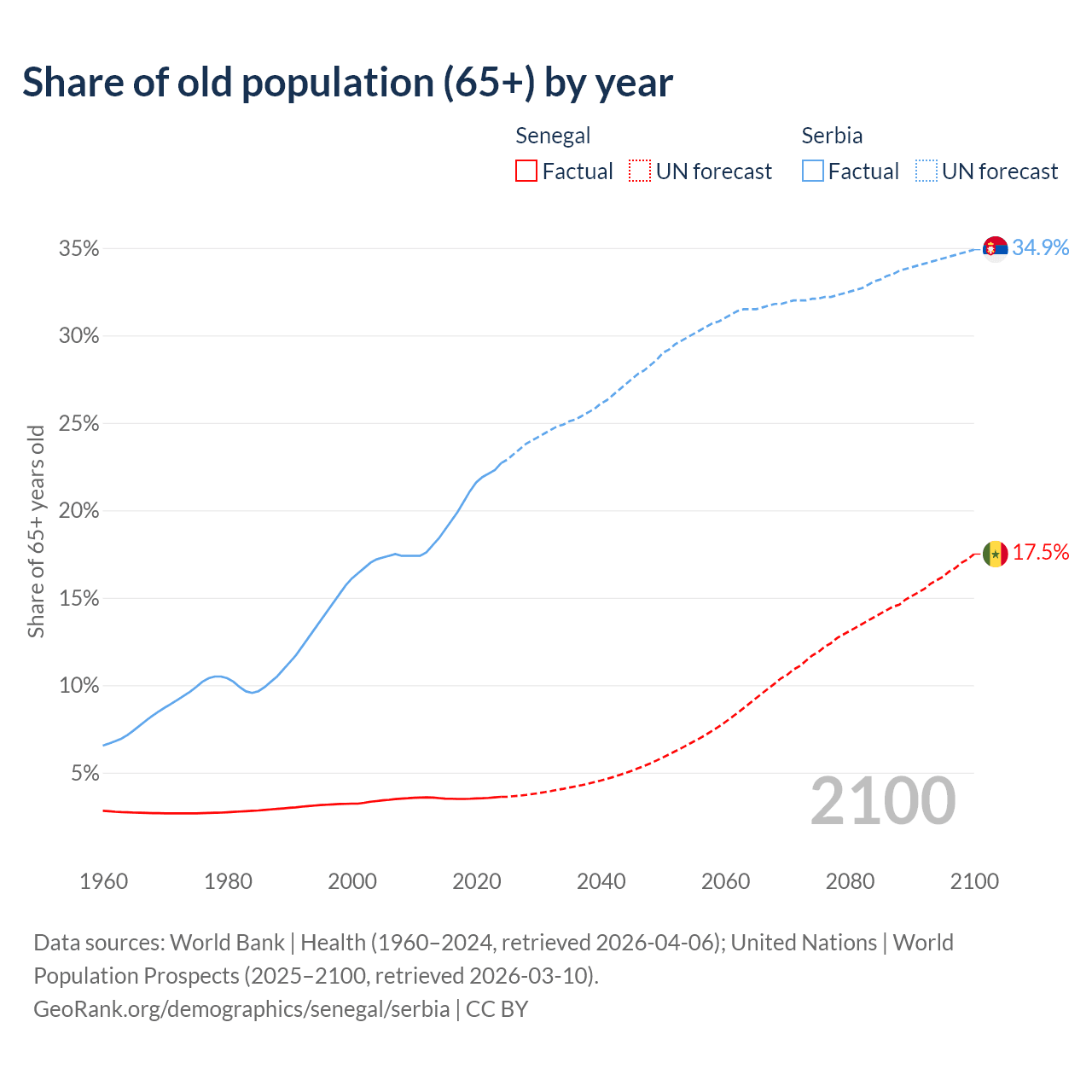 The share of older people aged 65 and over is 3.62% in Senegal and 22.7% in Serbia. Life expectancy in Senegal compared to Serbia .