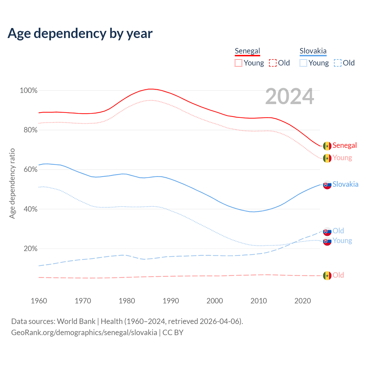 The share of older people aged 65 and over is 3.62% in Senegal and 18.5% in Slovakia. Life expectancy in Senegal compared to Slovakia .